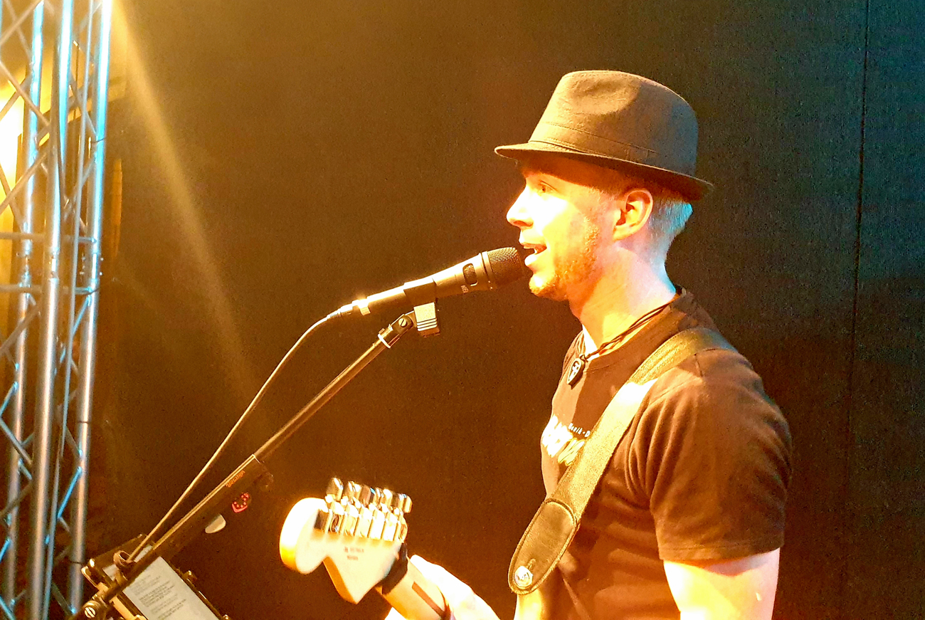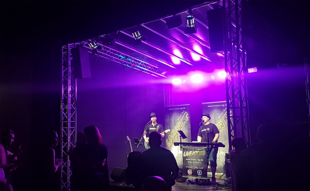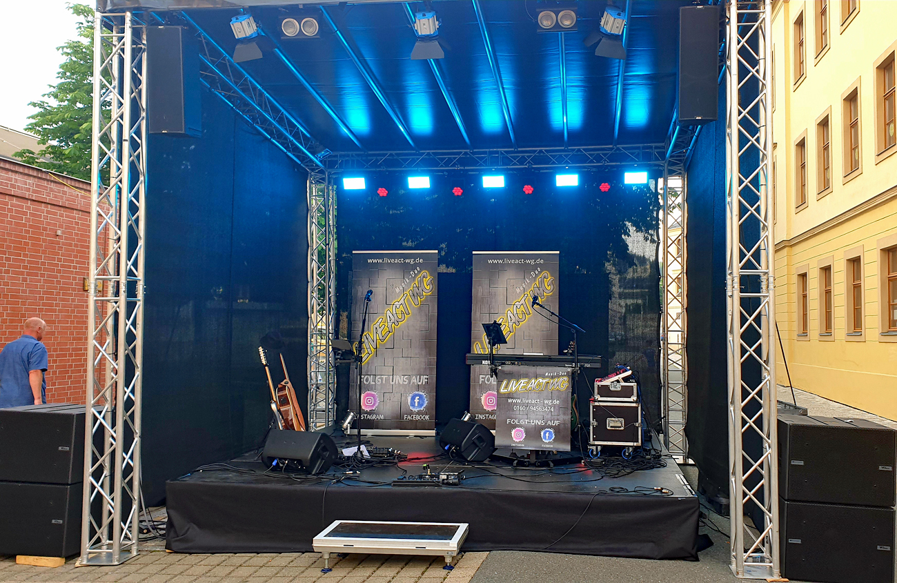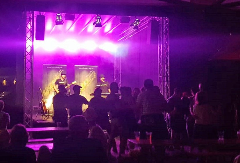 SKYLINEEVENTS hat sich natürlich nicht lumpen lassen und eine TOP Outdoorbühne 4 x 4 Meter hingestellt und die komplette Licht- und Tontechnik übernommen. So sind wir diesmal nur mit unseren Instrumenten und unserem Mischpult angereist. *Unnötige Anmerkung der Redaktion... im Radio lief tatsächlich der Song „Leichtes Gepäck“ von Silbermond… wie passend 😛