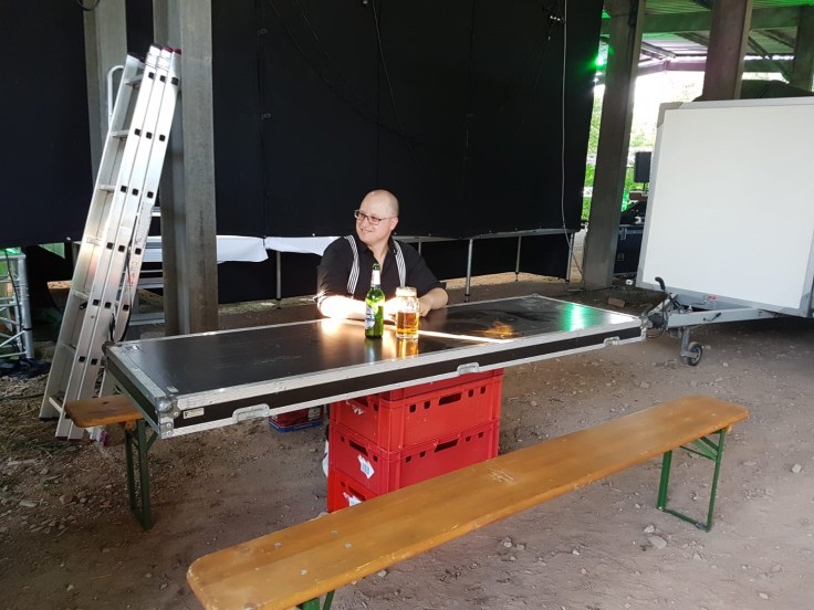 Um 17:15 war dann alles perfekt und wir haben uns erstmal ein kühles Bier gegönnt und im „Backstage“ aus Metzgerkisten und einem Case Deckel einen Tisch gebaut. Noch 2 Biertischbänke organisiert und fertig 😀 Man(n) muss sich nur helfen wissen.