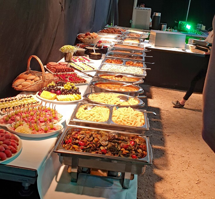 So langsam trudelten die Gäste ein und nach einem Begrüßungstrunk und etwas Zeit wurde auch schon das Buffet aufgebaut. Leute, das war der Hammer! Vom Spanferkel, über Lendchen, Lachs, Salate, Fingerfood, Vegetarisches, Obst, Schnitzel, Hänchen… und noch 1000 Sachen mehr – wurde hier groß aufgefahren. Und es hat wirklich sagenhaft geschmeckt!