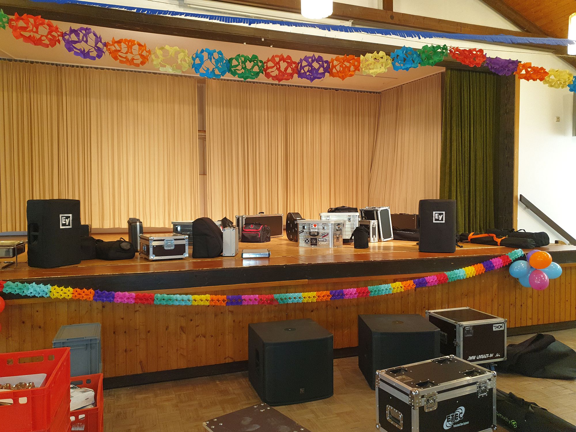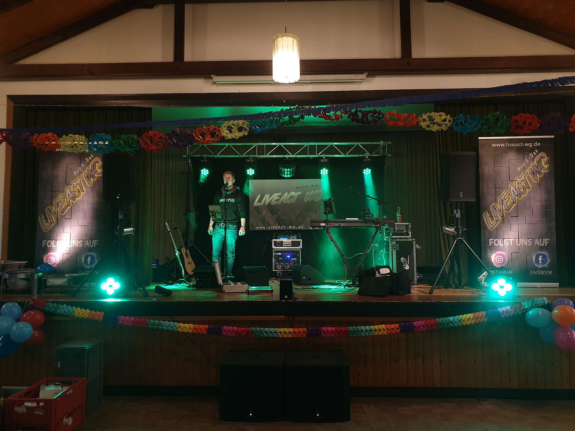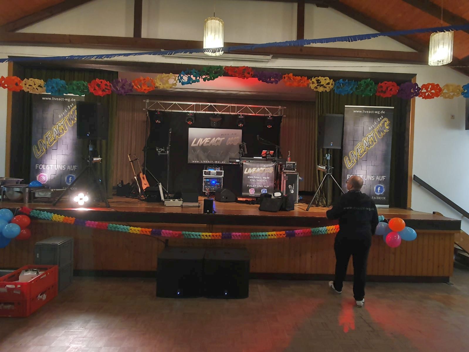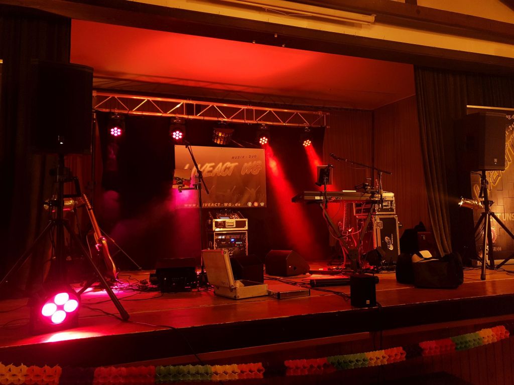 Gegen 14:30 Uhr begrüßten wir dann schon Markus Nützel am Bürgerhaus, der uns fleißig beim Ausladen geholfen hat. Ein herzliches Dankeschön an dieser Stelle! Markus ist auch kein Unbekannter für uns. Denn, wir hatten in 2016 die Hochzeit seiner Schwester und 2017 dann bei seinem eigenen Polterabend gespielt. So kam es auch zu Stande das die musikalische Neuausrichtung auf uns, die Liveact WG, viel. Immer schön wenn man sich wieder sieht und in bester Erinnerung bleibt 😀