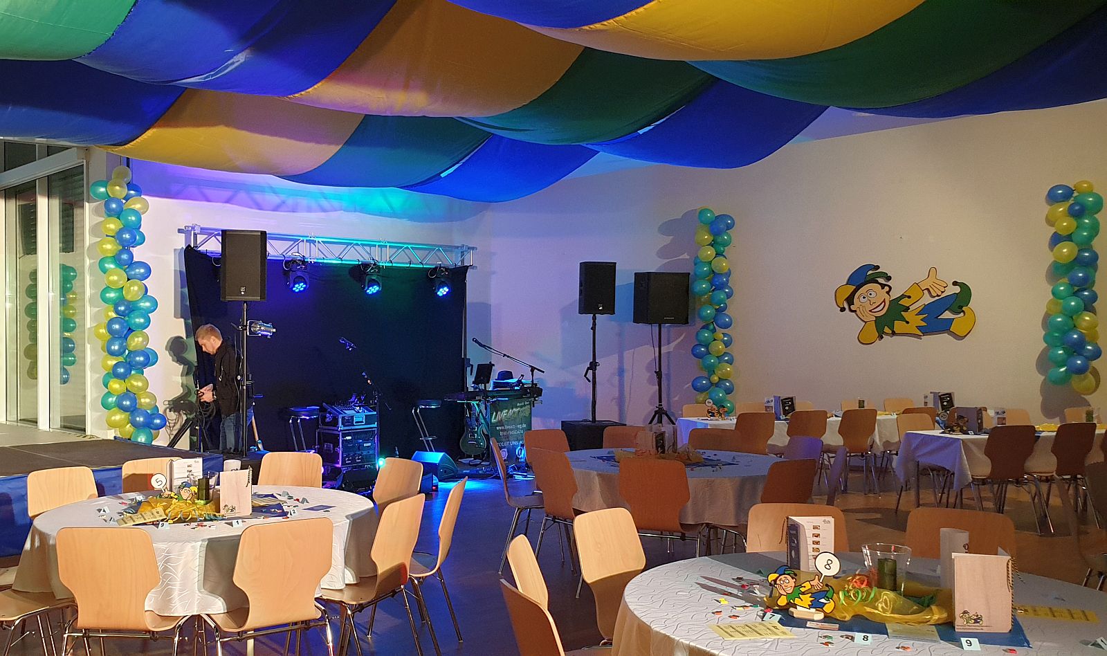 Los ging es für uns schon am Donnerstagabend vor den beiden Veranstaltungen. Denn unser ganzes Equipment bauen wir hier bereits einen Tag vorher auf. Die Fastnachtsfreunde hatten den Saal, bei unserer Ankunft, bereits herrlich geschmückt mit Luftballons, dem Vereinsemblem, Deko und Deckensegeln in den passenden Vereinsfarben. Die Licht- und Tontechnik, die Bühne und das Separee für den Elferrat standen auch schon bereit und so konnten wir ganz ungestört in unserer Ecke unser Equipment aufbauen.