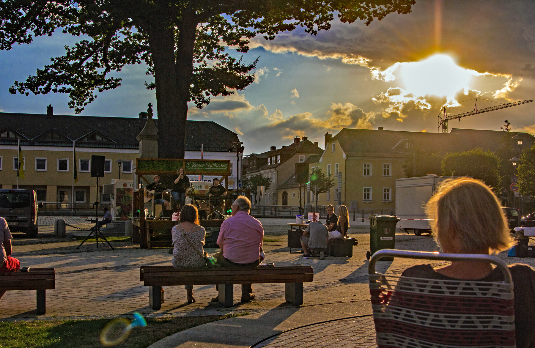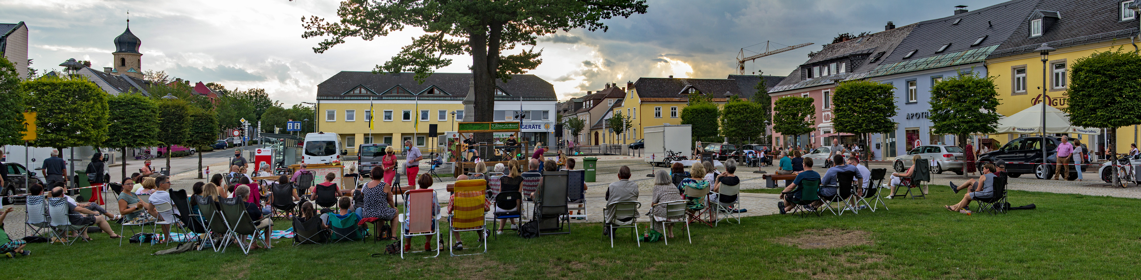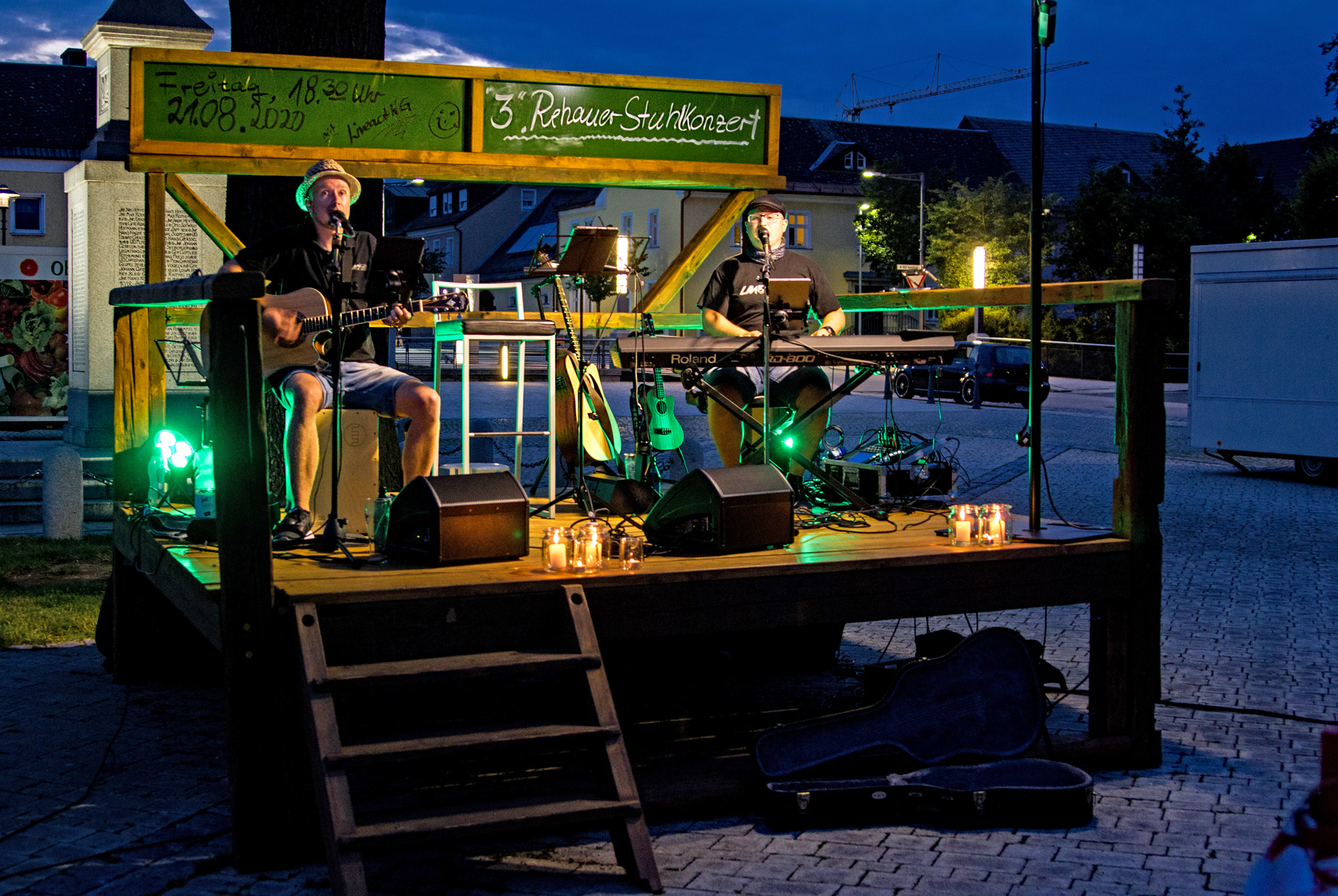 Eine Konzertreihe auf der Künstler eine schicke kleine Bühne mitten in Rehau bekommen. Direkt auf dem wunderschönen Maxplatz, bringen Besucher ihre Sitzgelegenheiten mit und lauschen in schöner Sommernachtskulisse verschiedenen Konzerten oder Vorlesungen. Großes Lob an die Stadt – wirklich eine Klasse Idee und eine hervorragende Umsetzung! Selbstverständlich wurde auch das Leibliche Wohl nicht vernachlässigt, so haben die umliegenden Gastronomen vom El Gusto und dem Früchtla die Bewirtung des Maxplatzes übernommen.