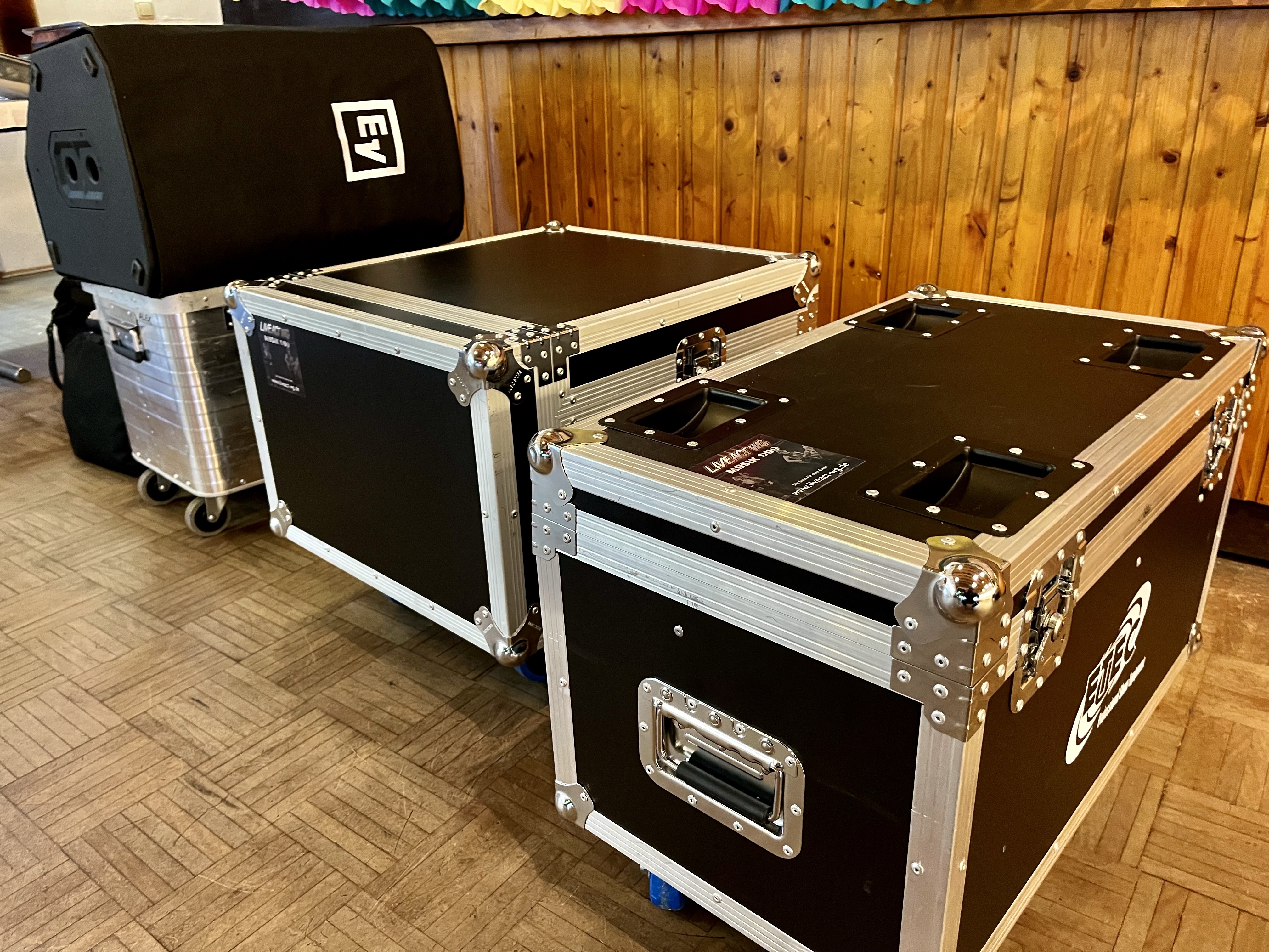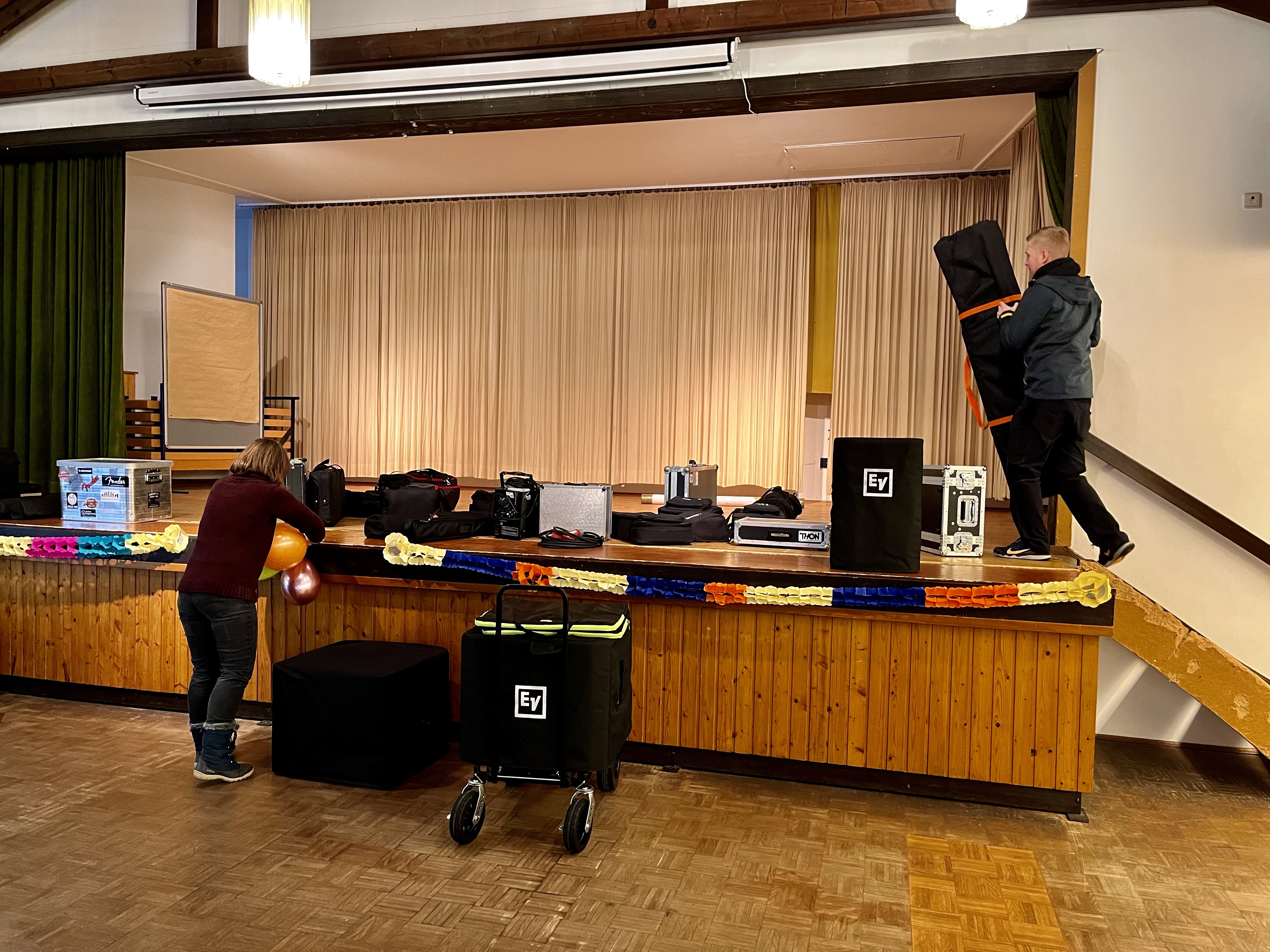 Equipment technisch, haben wir 2 Stück 18er Bässe und unsere großen 12er Tops als PA eingepackt. Da die Bühne schön groß ist, haben wir natürlich auch die Traverse samt Movingheads eingepackt, soll ja auch ordentlich ausschauen das Ganze.