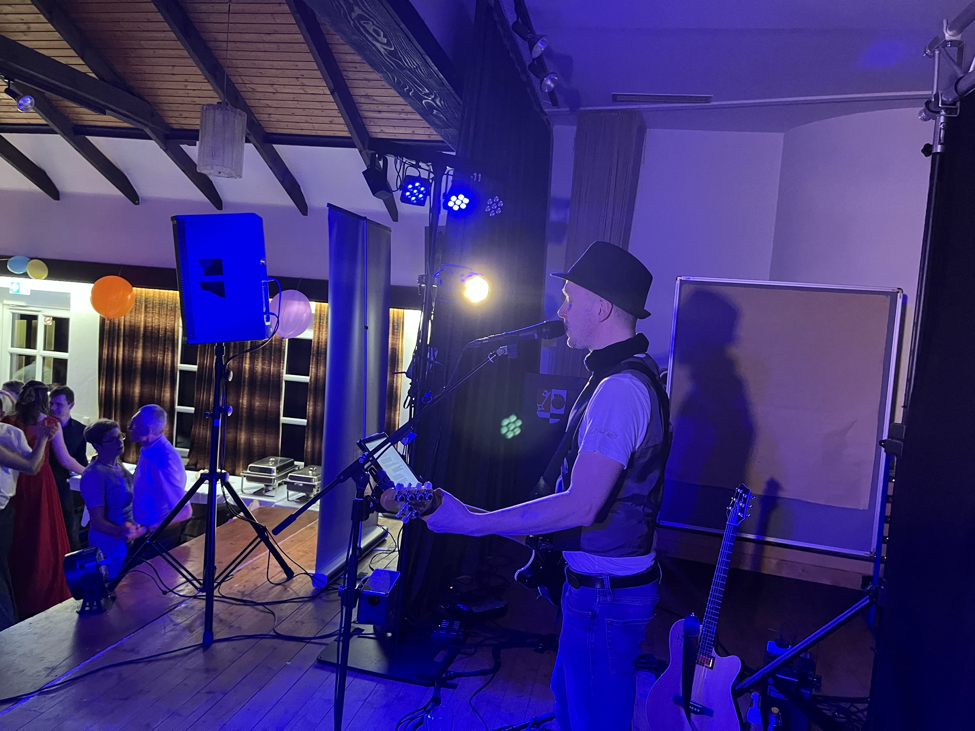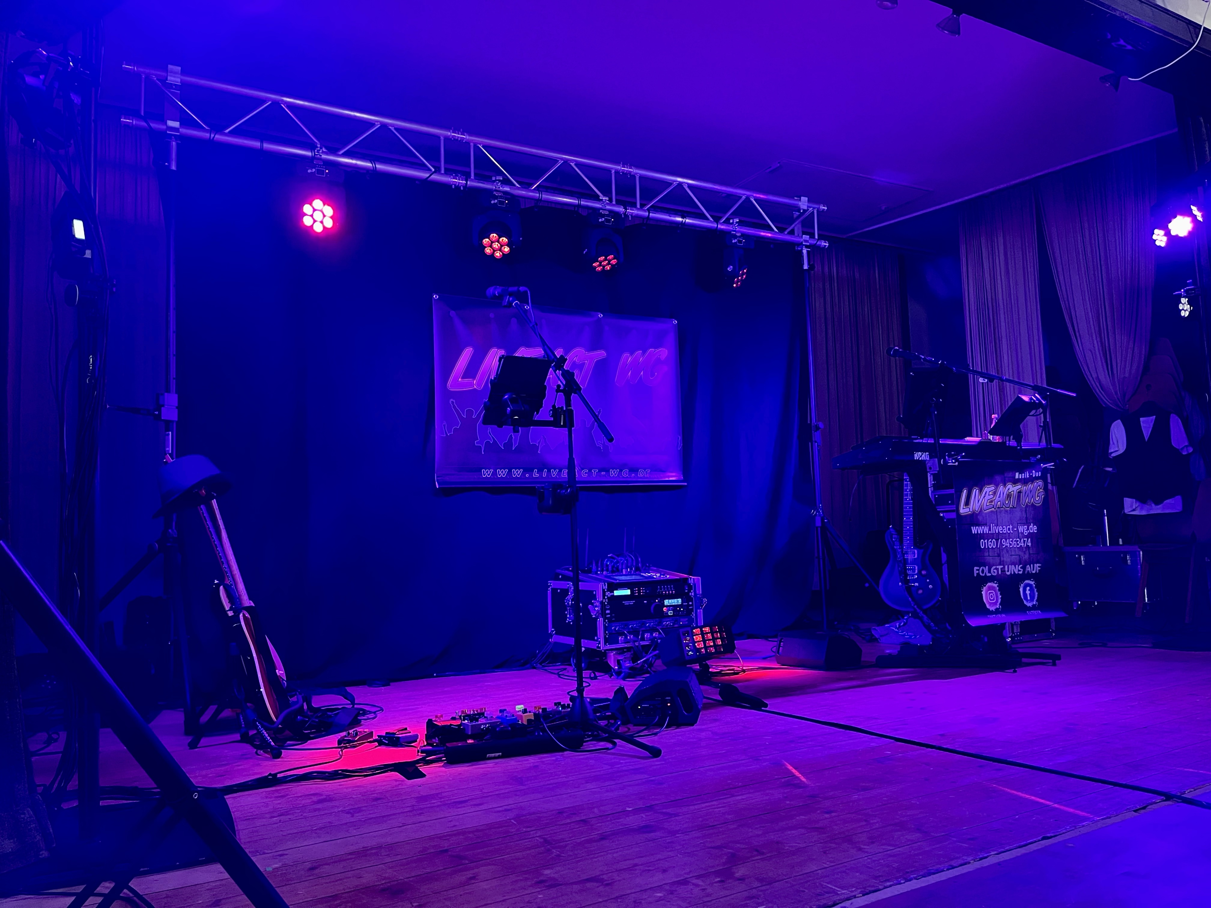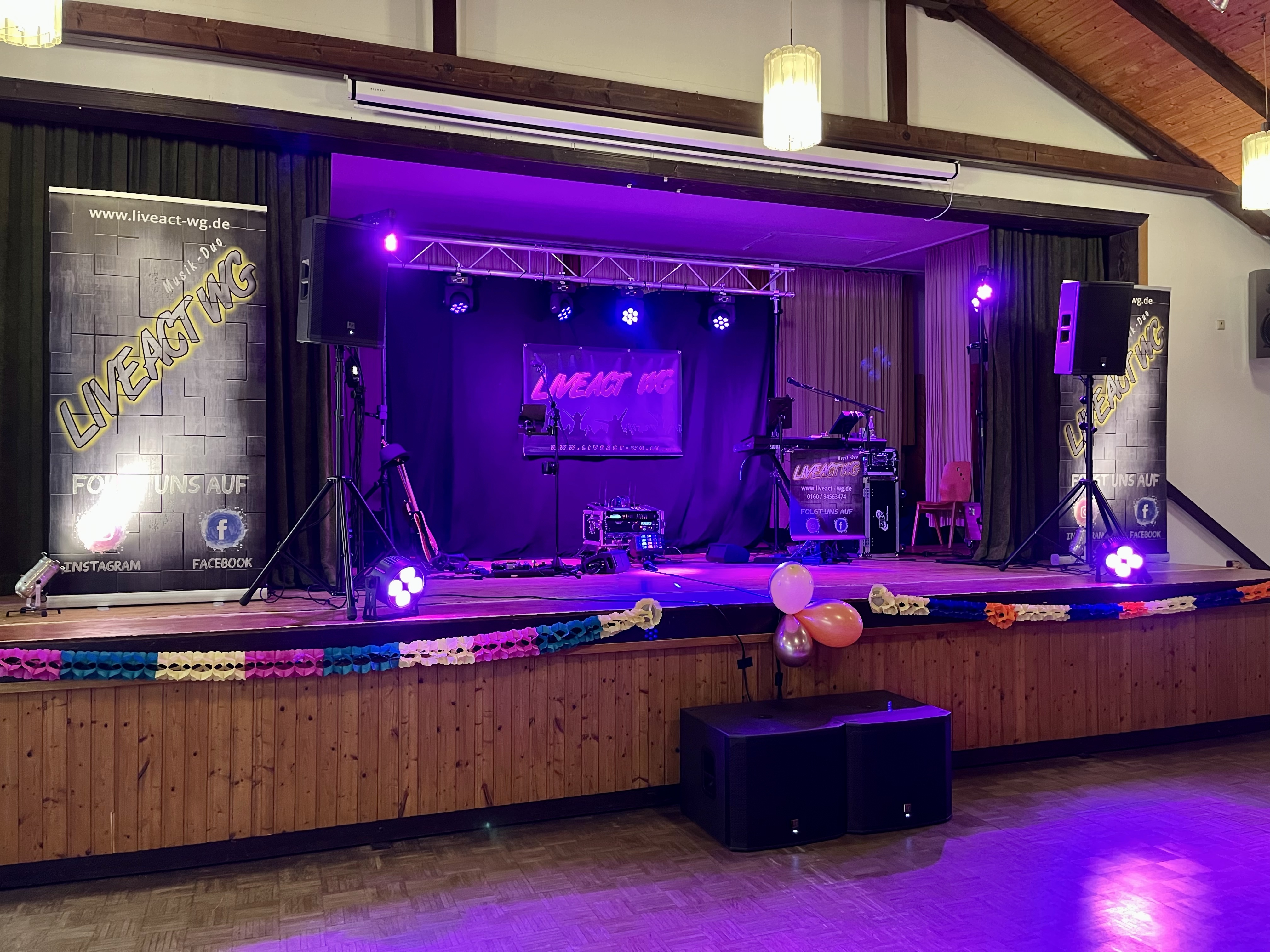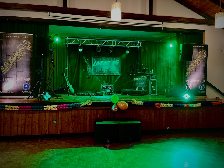 Ergänzt mit den großen LED Bars und der Wolfmix DMX Lichtsteuerung war das wieder eine runde Sache. Mit den beiden Roll-Up Bannern haben wir ein schönes breite Bühnenbild gezimmert. Hat einwandfrei gepasst zu dem schön geschmückten Saal.