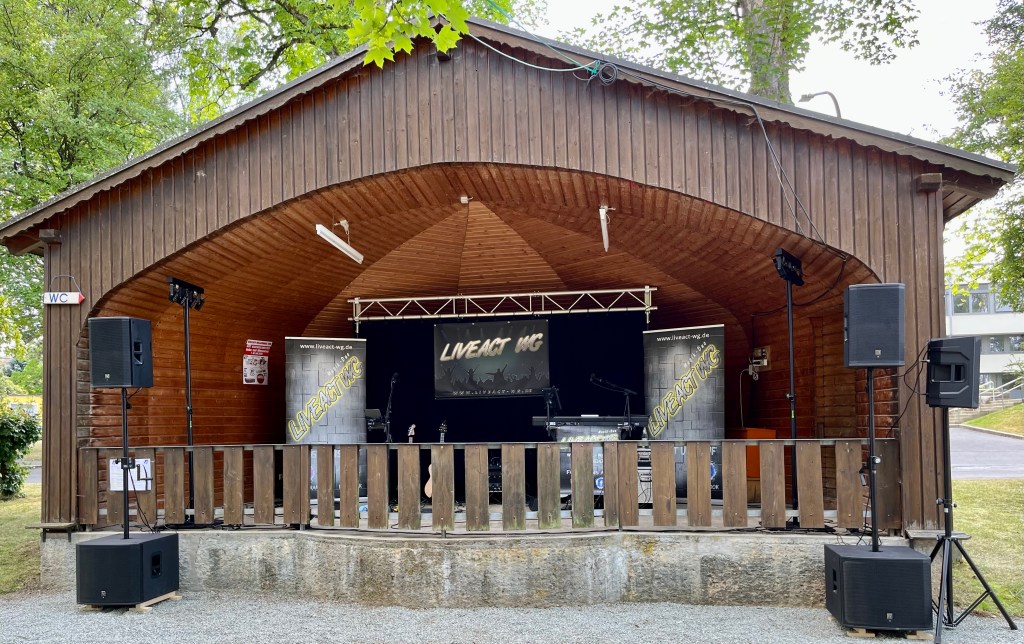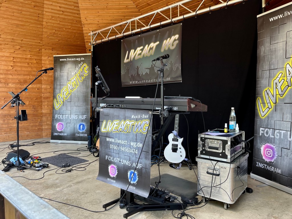 Aufbau und Soundcheck gingen schnell von der Hand. Als Backdrop schön die Traverse und unsere 2 Banner gestellt, dass alles wieder sauber und ordentlich aussieht, so wie man es von uns gewohnt ist. Kurz nach 14:30 ging es dann auch schon los mit unserer Musik.