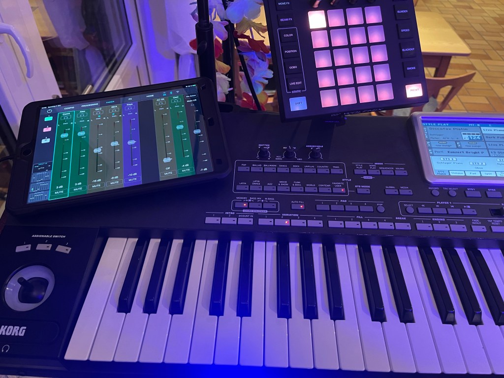 Wir hatten zwar etwas mehr Zeit für den Soundcheck und die neue Technik eingeplant, aber Alex hatte sich schon so in das neue Teil reingefuchst, dass wir wirklich schnell fertig waren. Premiere hier und absolutes Killerfeature der „offline Soundcheck“ – kurz ein Lied mit allem Drum & Dran live auf mehrere Spuren auf eine SD Card aufgenommen – dann von der SD Card 1:1 auf die einzelnen Mischpultkanäle gespiegelt und vom Raum aus perfekt fürs Publikum abgemischt. Danach wieder alles auf die richtigen Eingangskanäle umgestellt – Et Voila – So geht Soundcheck heute!