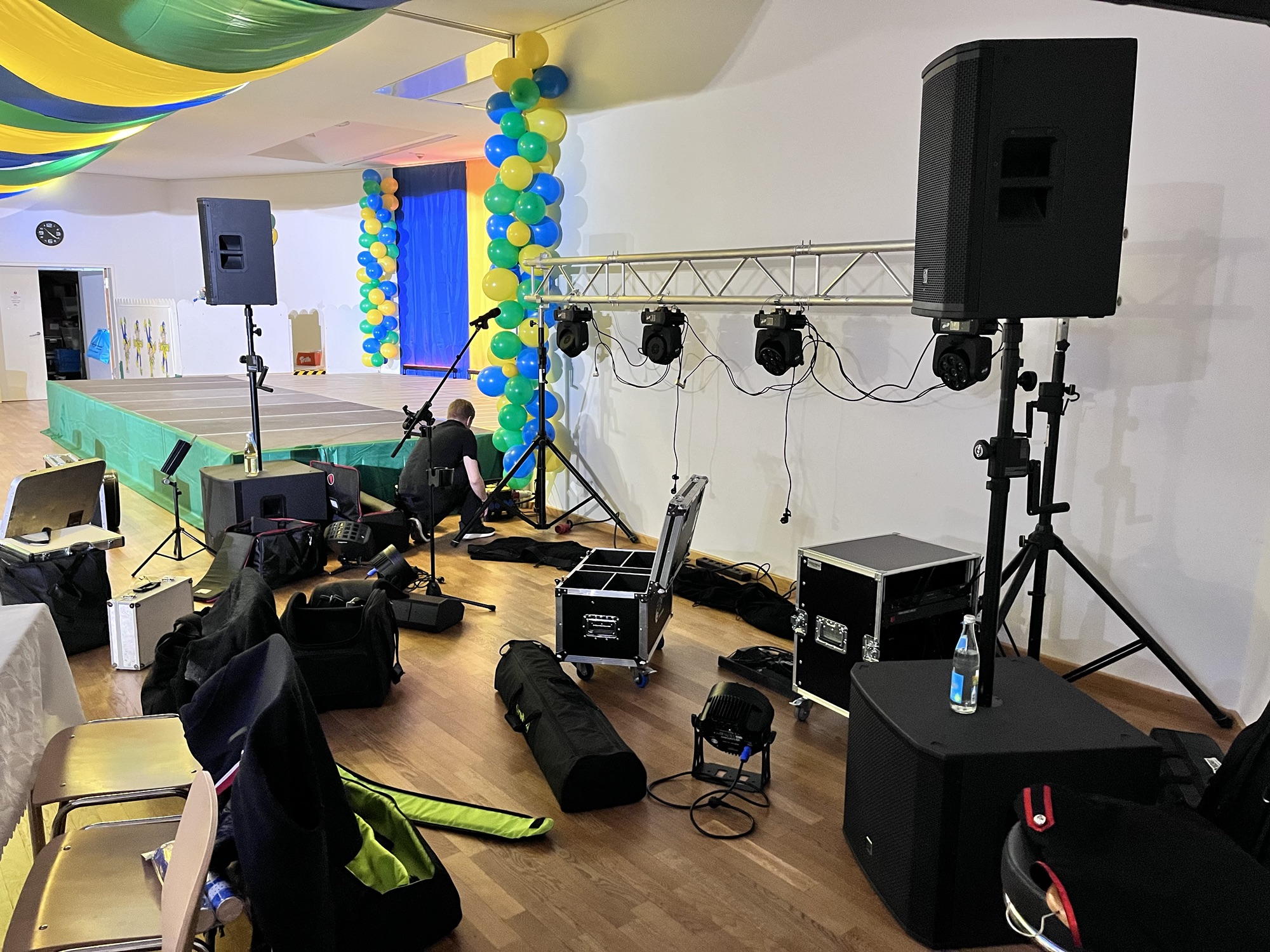 Technik von uns waren wieder unsere 2 EV 18SP Bässe und die traumhaften ETK 12P Topteile. Gemischt haben wir über unser neuer Allen & Heath CQ20B Digitalmischpult. Lichttechnik Traverse mit 4 x ETEC 7Q MKII Movingheads, 2 x Cameo Flat Pro Spotix4, 2 x Eurolite SLS30 COB, 2 x ADJ Dotz 2.4 als Tanzflächenbeleuchtung und unser Eurolite D-2000 – alles gesteuert vom Wolfmix W1 DMX Pult.