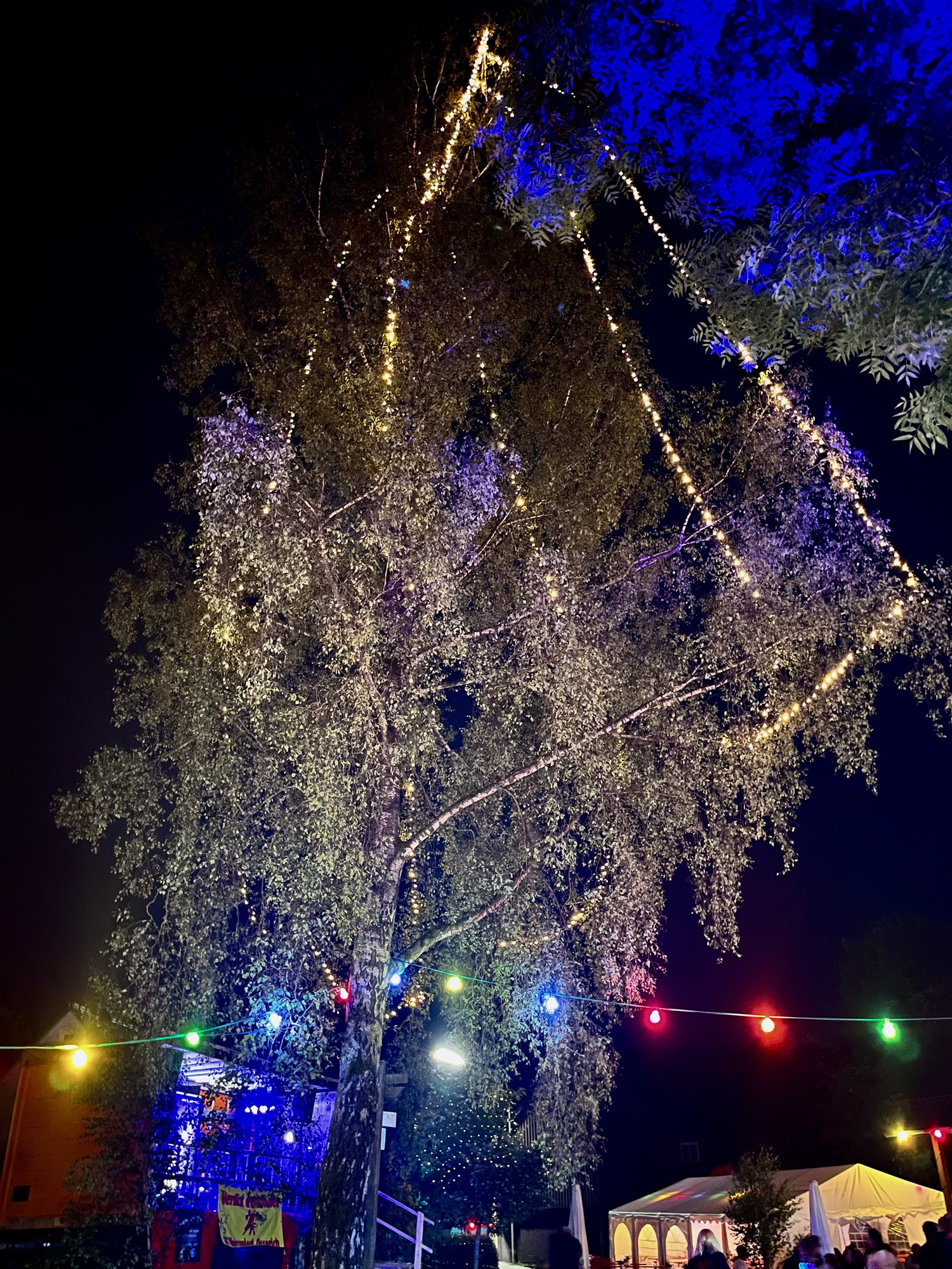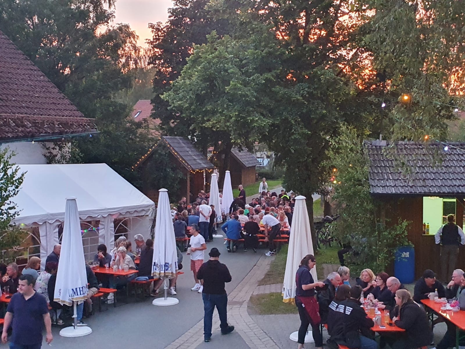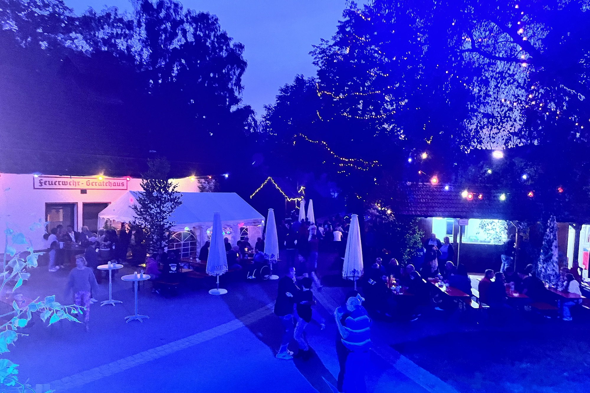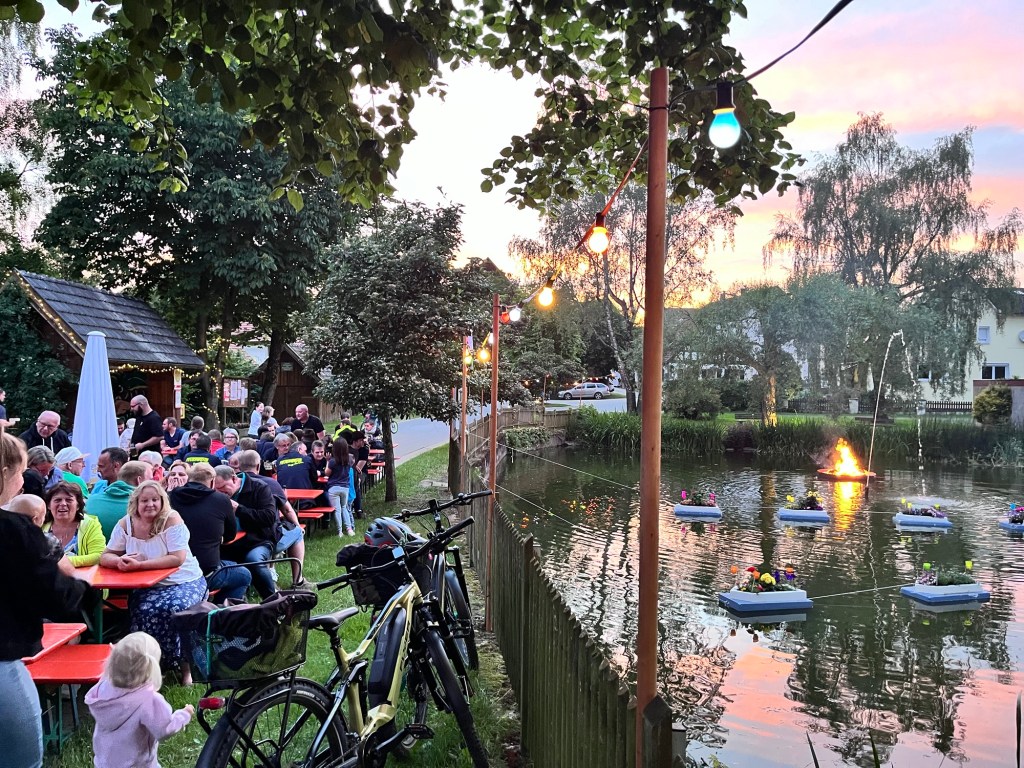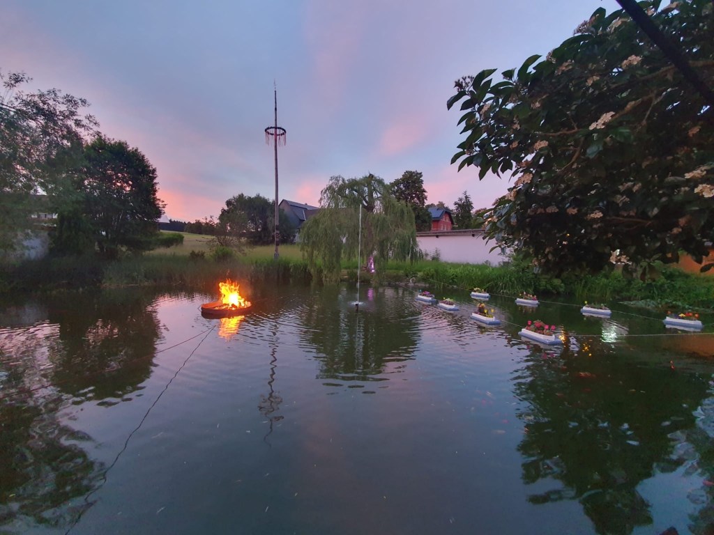 Mit einsetzten der Dämmerung wurde dann auch der „Lichterzauber“ entfacht! Der Dorfplatz, der Dorfteich und die umliegenden Bäume wurden allesamt beleuchtet und in Szene gesetzt, was dem Areal eine einzigartige Atmosphäre gegeben hat. Auf dem Dorfteich wurde sogar ein Lagerfeuer entzündet. Es sah wirklich einfach genial aus! Und auch die Stimmung war wirklich super 🍻🥳 Bis nach 1 Uhr wurde fleißig getanzt und mitgesungen.