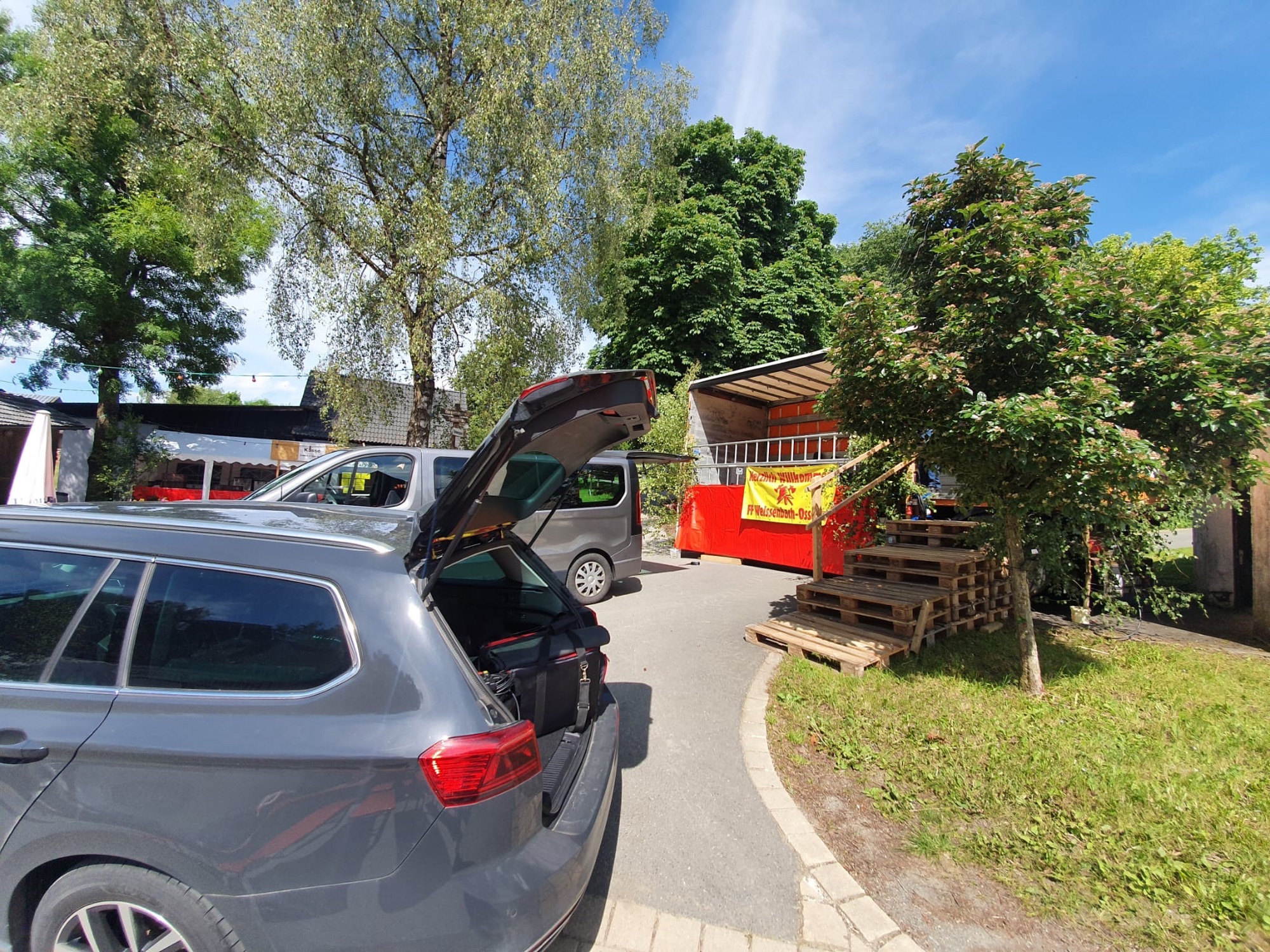 Über einen Polterabend kam der Kontakt nach Weißenbach zu Stande, und so wurden wir kurzerhand ein paar Tage später zum besagten Fest gebucht. Voller Vorfreude haben wir uns so am Nachmittag aufgemacht, denn der Kontakt war super sympathisch und auch das geplante Fest klang einfach nur super! Gegen 15:30 Uhr waren wir dann vor Ort zum Aufbau, denn es ging diesmal schon gleich um 18 Uhr los.