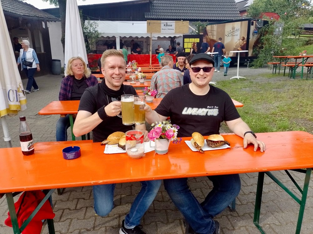 Nach einer kurzen Stärkung an der hervorragend sortierten „Fressmeile“ ging es dann pünktlich gegen 18 Uhr los. Die Sonne strahlte auch noch vom Himmel und schuf die perfekte Kulisse für das bunte Treiben. Zugegeben, war es am Anfang schon fast ein bisschen zu warm auf unserer Hängerbühne 😅 aber nachdem die Sonne dann hinter einem Baum verschwunden war, war die Temperatur perfekt.