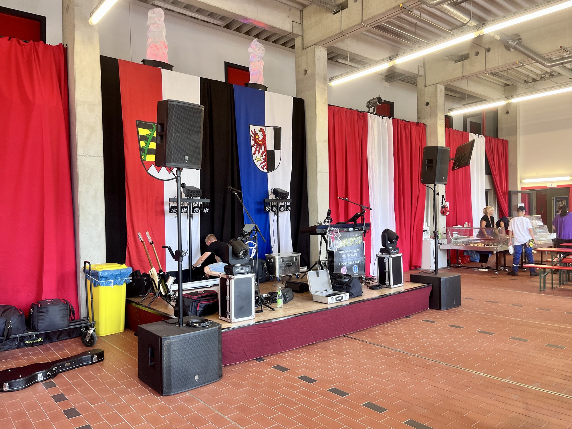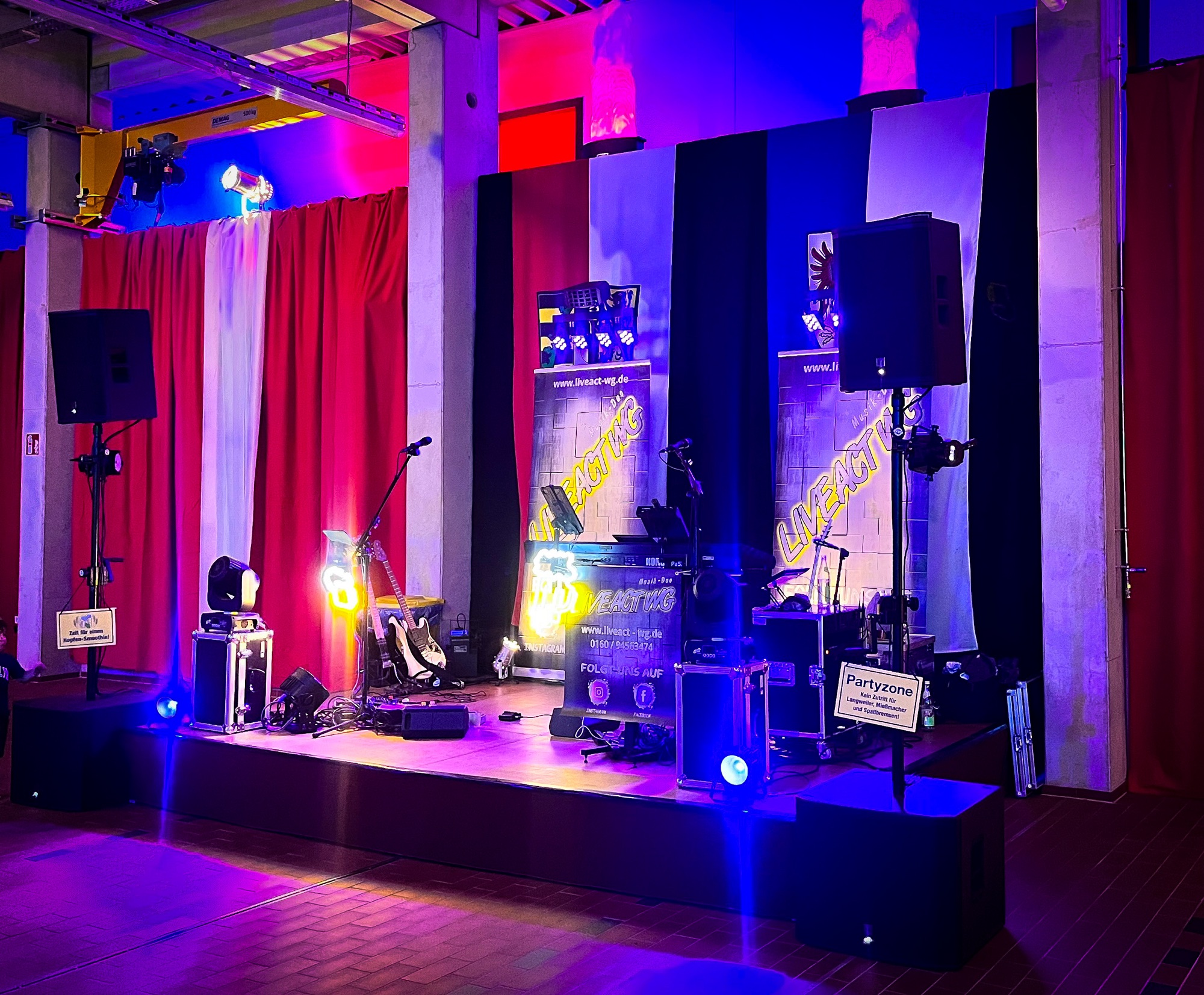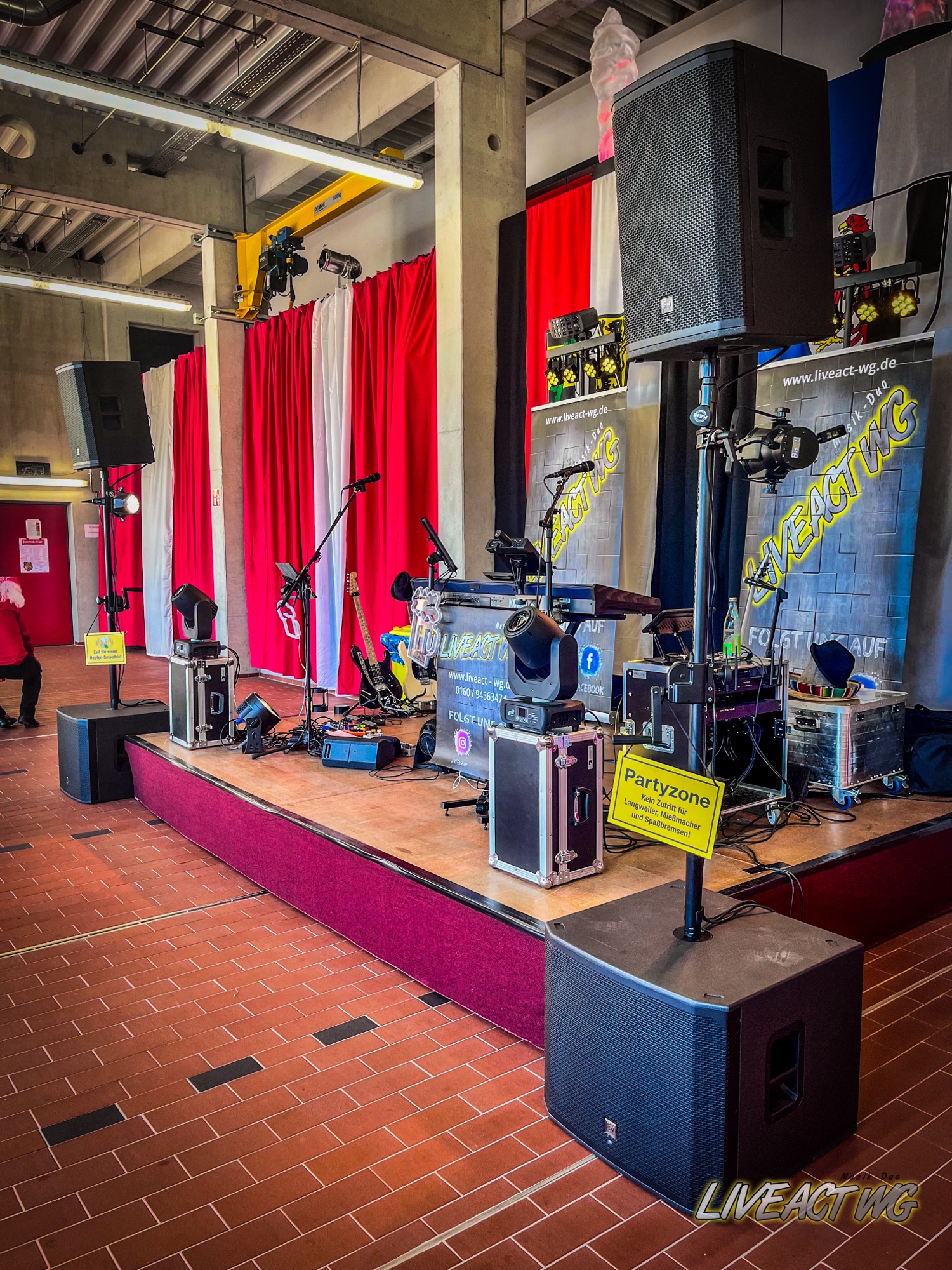 Die Bühne haben wir mit 2 x CLB4 Bars, 2 x ETEC Spot 150, 2 x Eurolite SLS 30 COB, 2x Eurolite D2000, 2 x Cameo Spotix4 Beleuchtet und 2 x Grundlicht Mini Stage PAR CW/WW/A beleuchtet. Alles wieder DMX gesteuert von unserem Wolfmix W1. Die FFW Oberkotzau hat die Halle auch noch mit LED Flammeneffekten und diversen PAR Strahlern ausgeleuchtet – das sah wirklich cool aus! Noch bissl LED Deko dazu und fertig 🤩