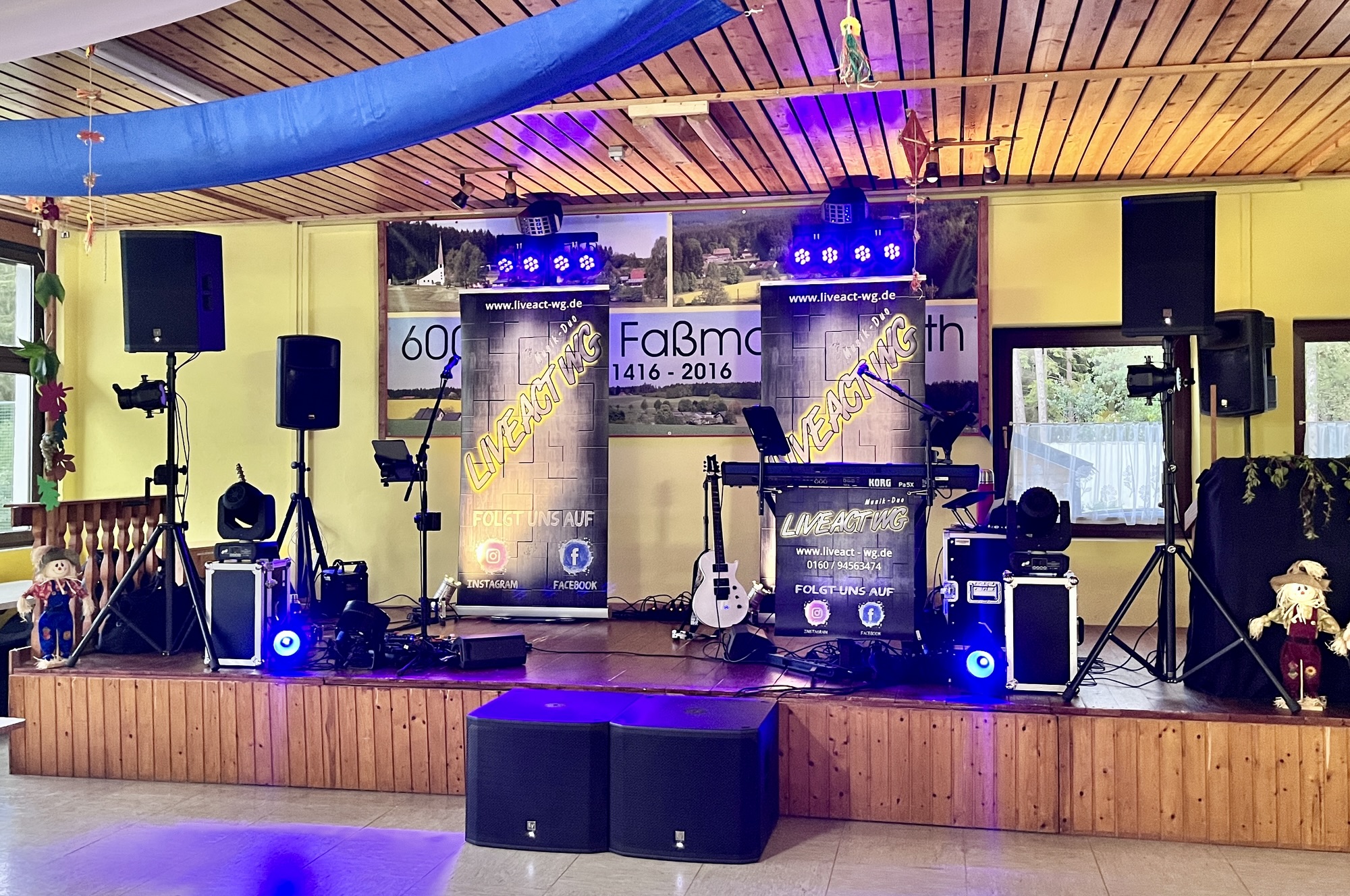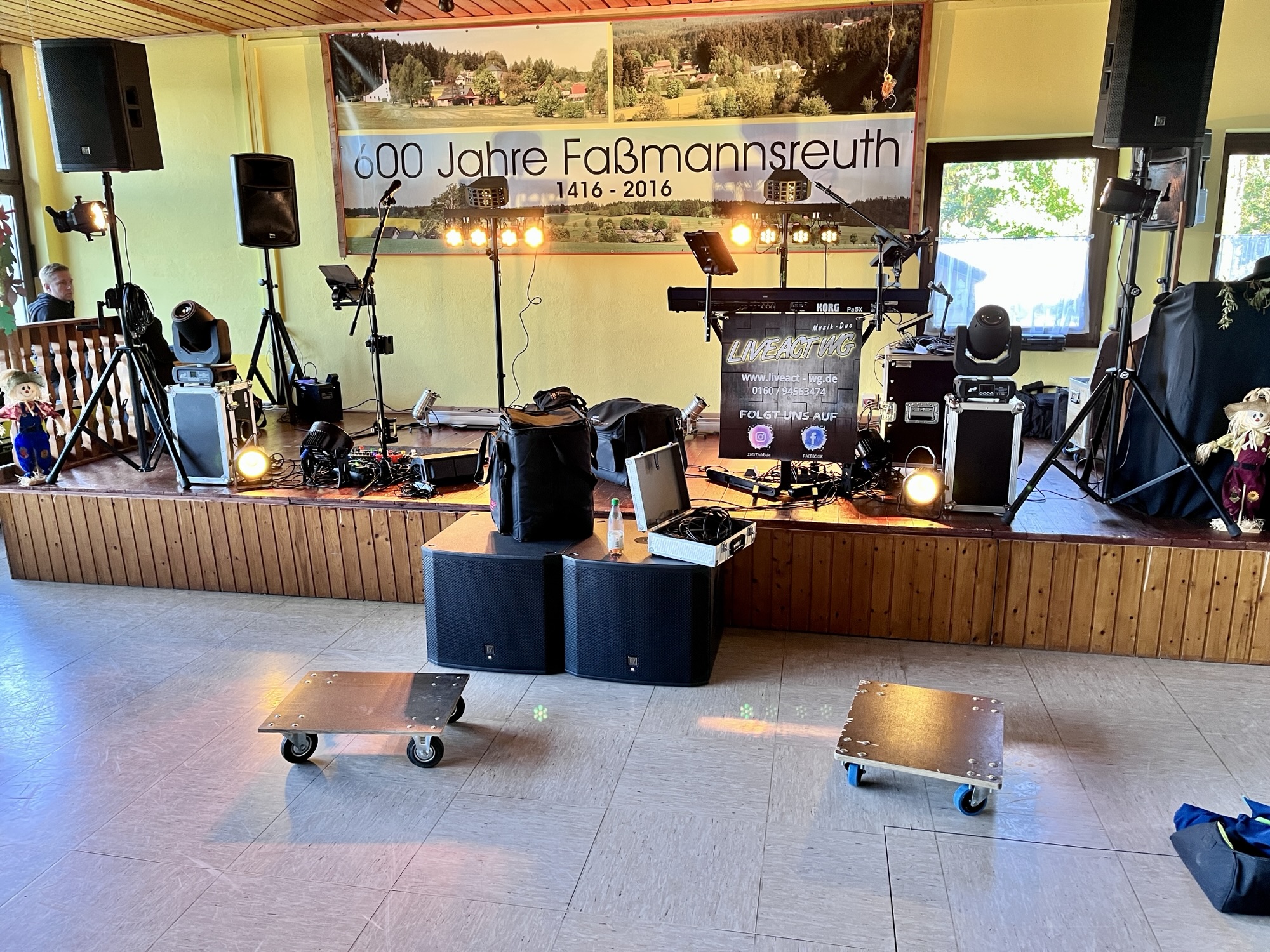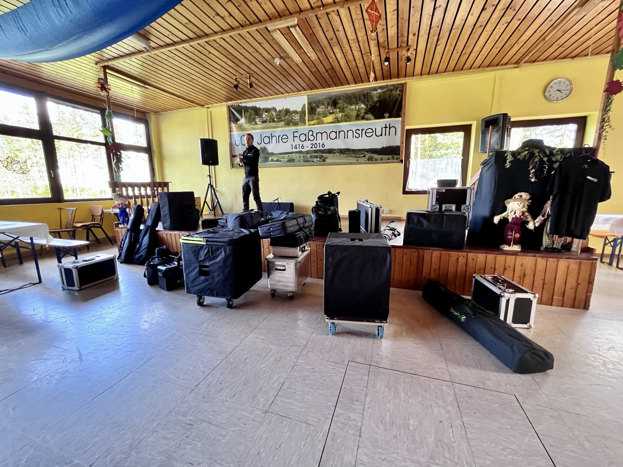 Gegen 16 Uhr haben wir uns mit Bubi, dem Organisator -Urgestein und guten Seele des Vereins SV Faßmannsreuth, getroffen um alles aufzubauen. Da wir die Location schon gut kennen, ging das alles wie geschnitten Brot von der Hand. Soundgecheckt war auch schnell und so konnte sich Alex noch schnell um unser neuestes Spielzeug, dem „Audi Livemitschnitt via MacBook“ widmen. Dank LiveTraxx und unserem Allen & Heath CQ 20B Digitalmischpult lief auch das einfach als Plug&Play durch.