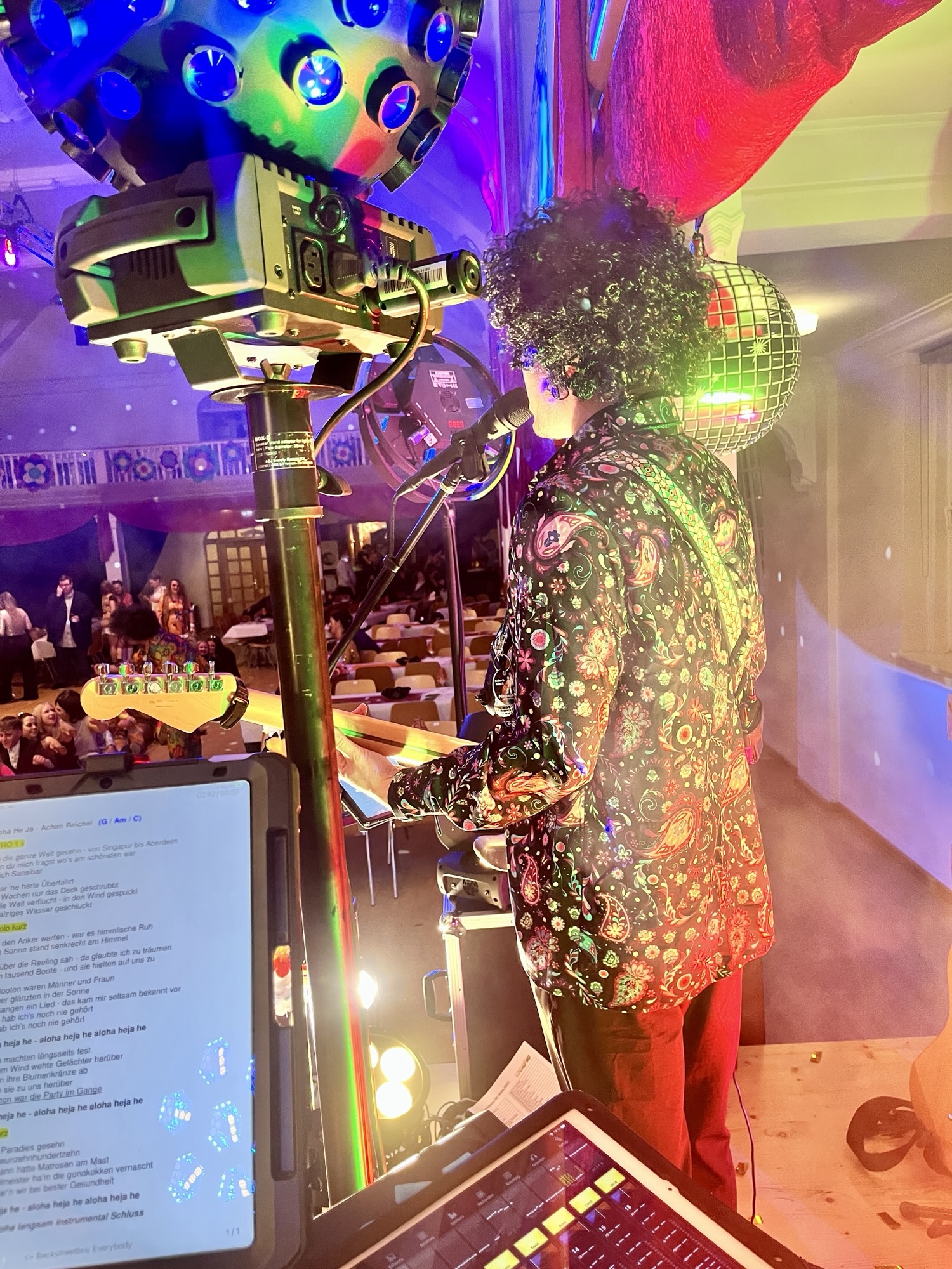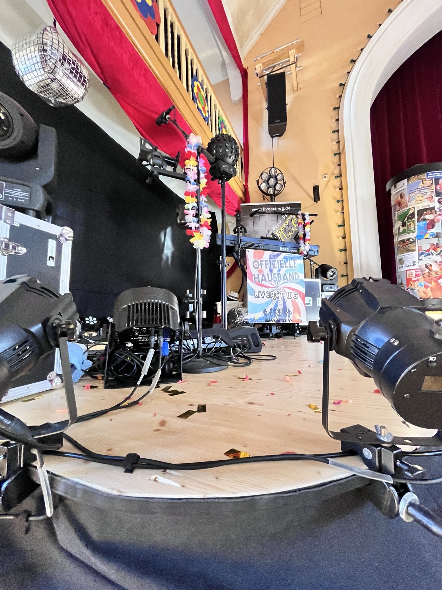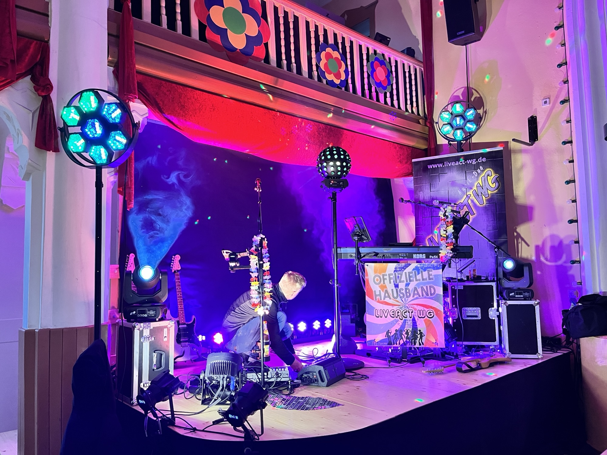 Nachdem der Soundcheck reibungslos lief, konnte sich Alex direkt an die Programmierung der Lichtshow machen. Neu im Gepäck: zwei richtig schicke Vintage-Scheinwerfer und – für die Discovibes – ein Spiegelkugeleffekt.