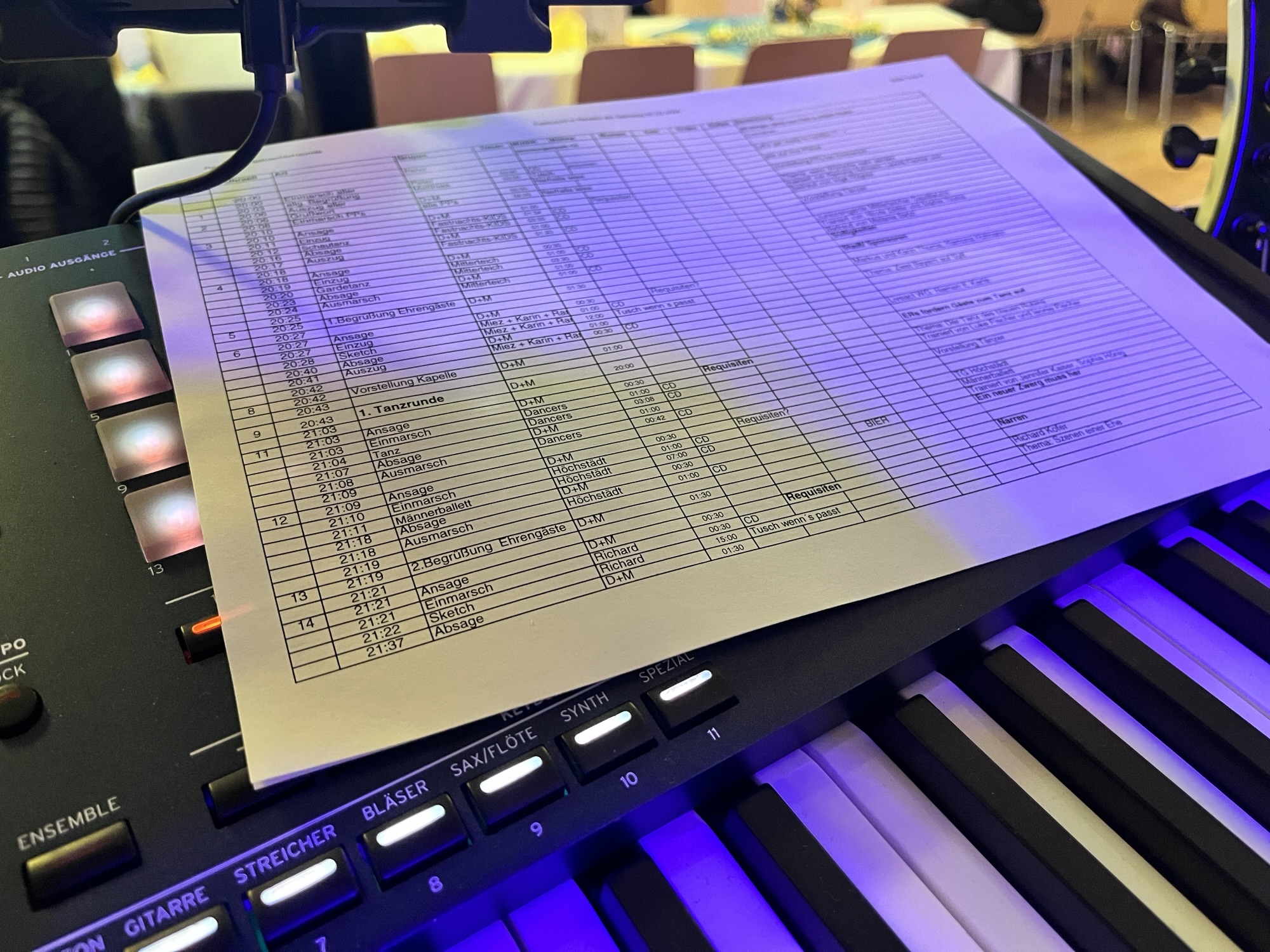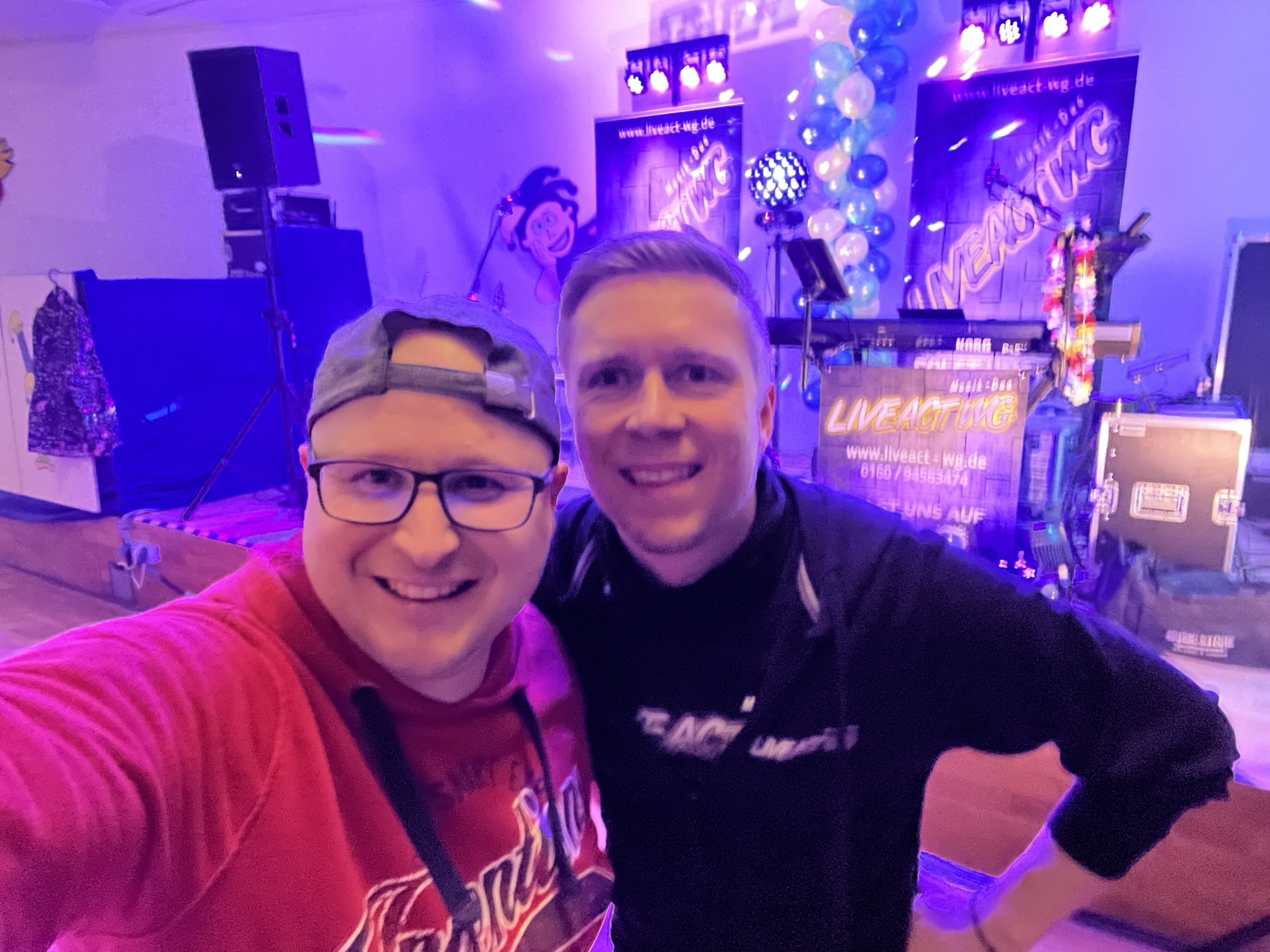 Wir haben kurzerhand unseren „alten Platz“ geräumt und sind auf die Hauptbühne des Egerland-Kulturhauses gezogen. Mehr Platz, beste Sicht in den Saal – perfekt! Und gleich neben uns, unser Freund Peter, dem DJ und Haustechniker 😉