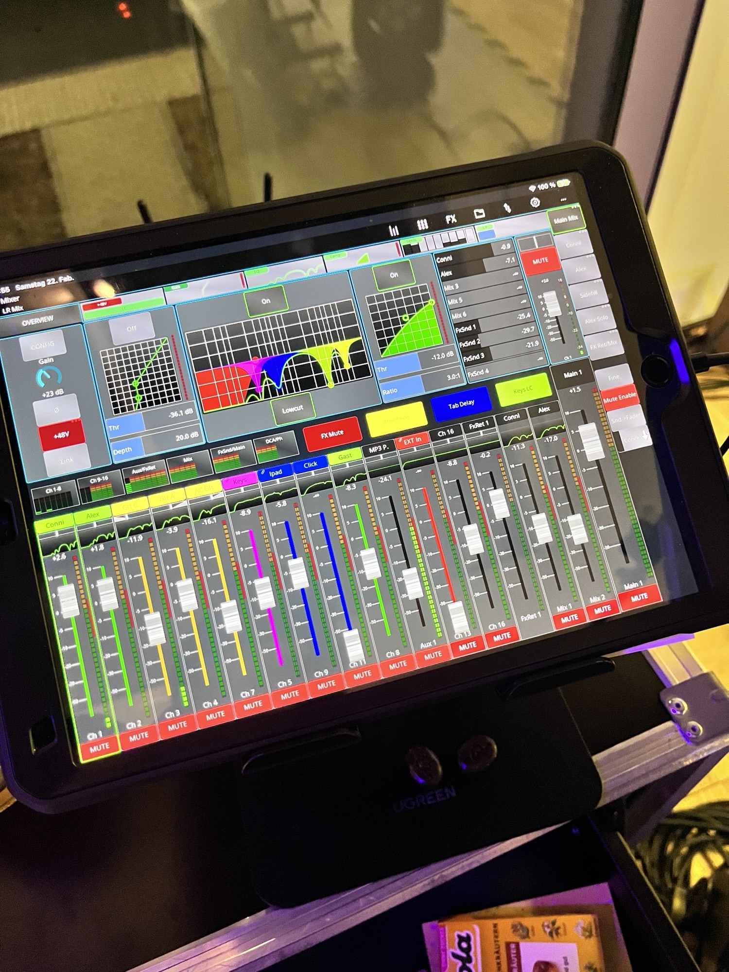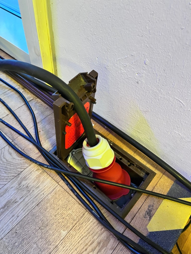 Ein kleines technisches Highlight möchten wir nicht unerwähnt lassen: die Glanzleistung deutscher Ingenieurskunst – ein 32A-Starkstromanschluss direkt im Bühnenboden nach oben gerichtet. Was man davon hält? Nun ja … 😜