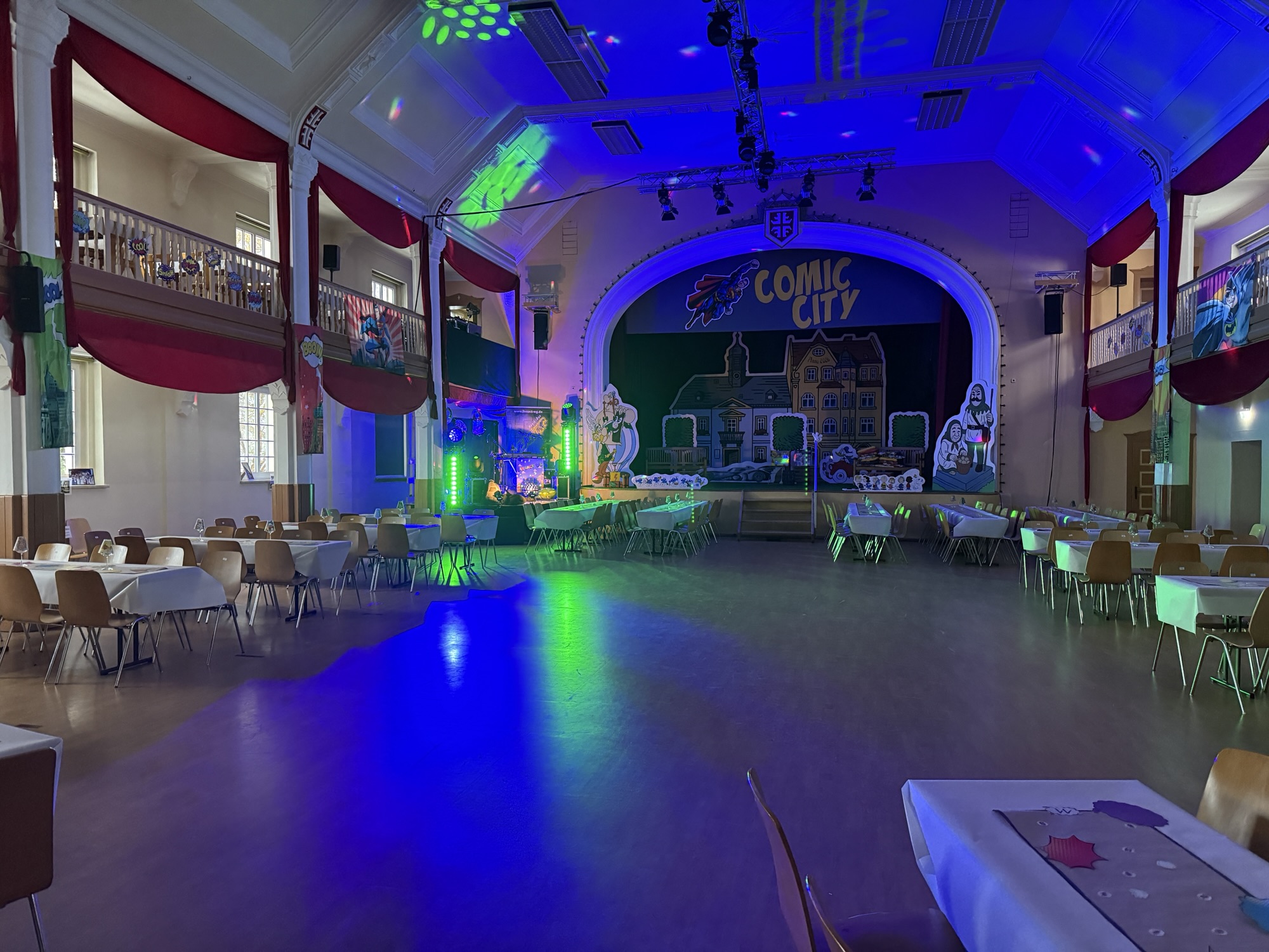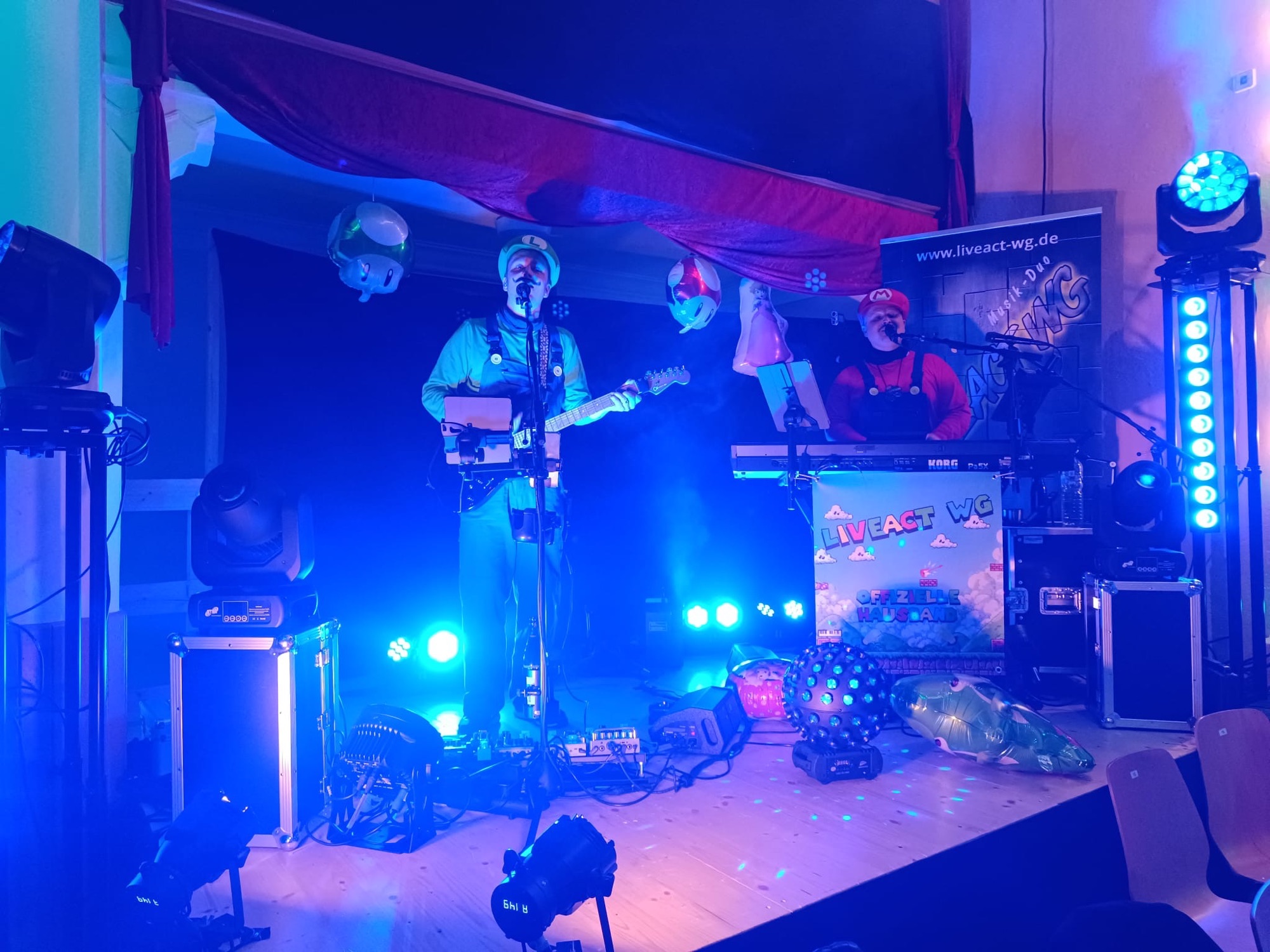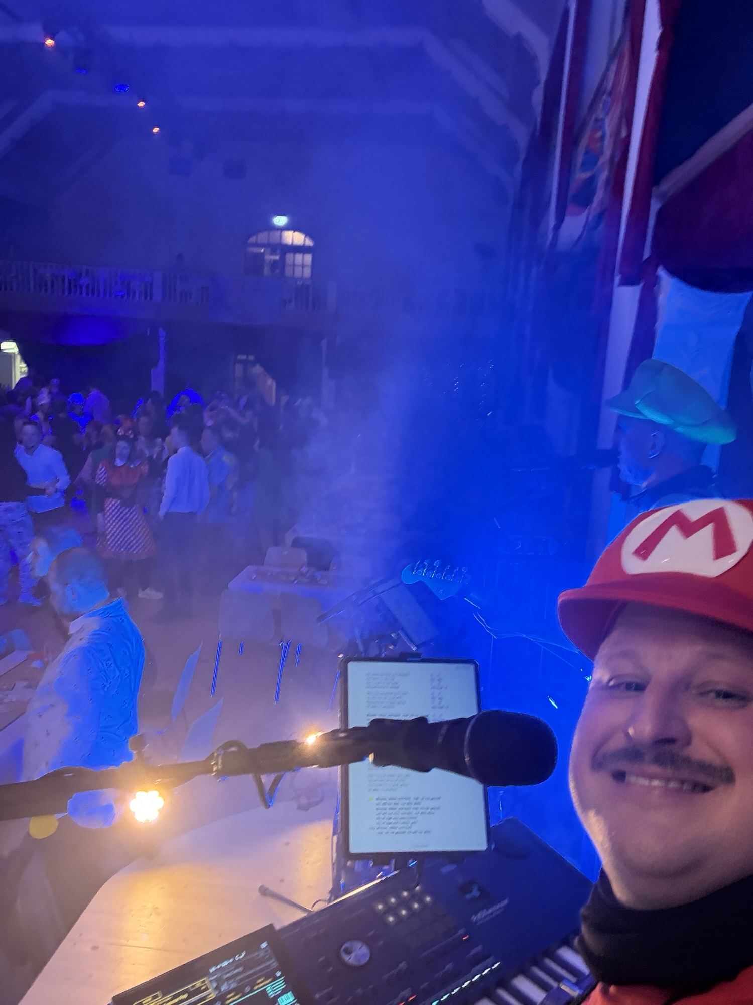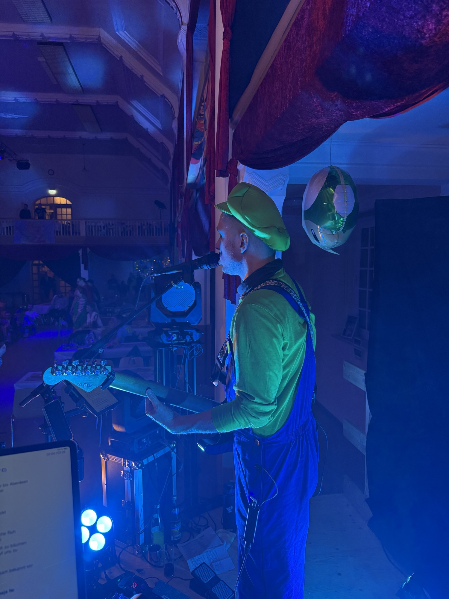 Während Alex schon ab Donnerstag mit den Fastnachtsfreunden beim Aufbau der Saaltechnik beschäftigt war, starteten wir am Freitagnachmittag mit Aufbau und Soundcheck von unserem Equipment. Neben unseren Instrumenten hatten wir diesmal auch ordentlich Licht im Gepäck: neue Movinghead-Tower, zwei mächtige Bee-Movingheads, Etec 150 Spot Movingheads und ein farbenfrohes LED-Grundlicht – perfekt abgestimmt auf das Comic-Motto. Ein passendes Keyboard-Banner durfte natürlich nicht fehlen. Kostümiert waren wir als die Mario Brothers – Alex als Mario und Conni als Luigi!