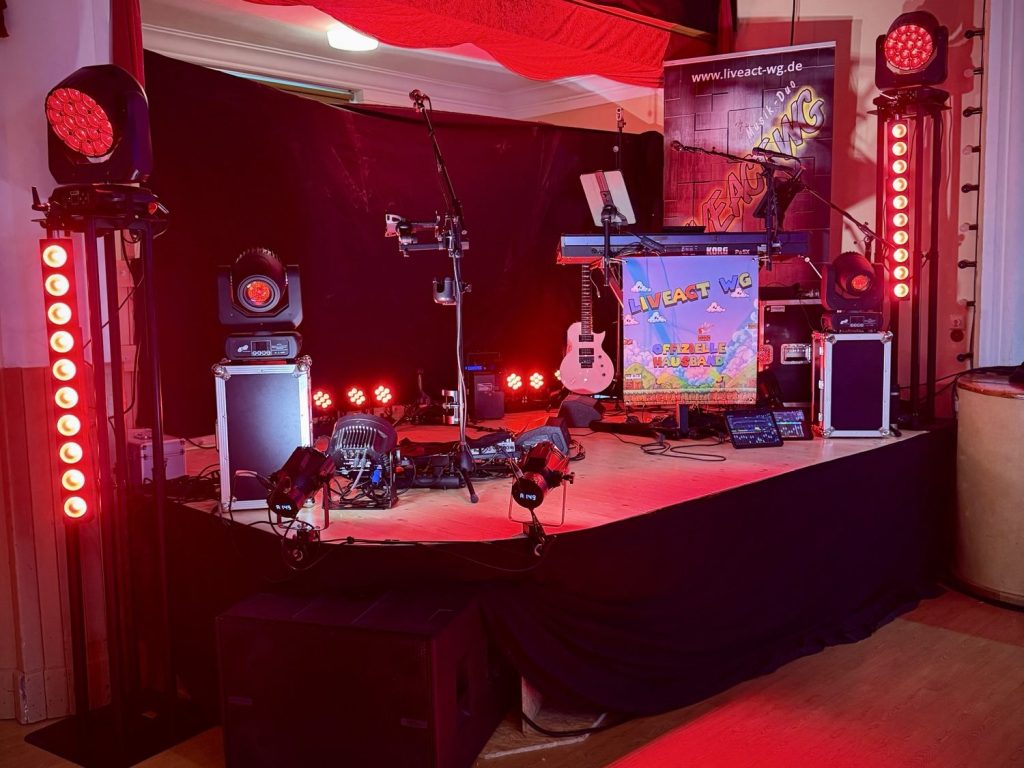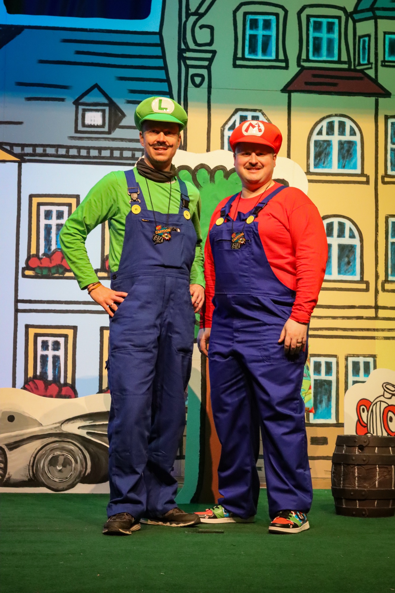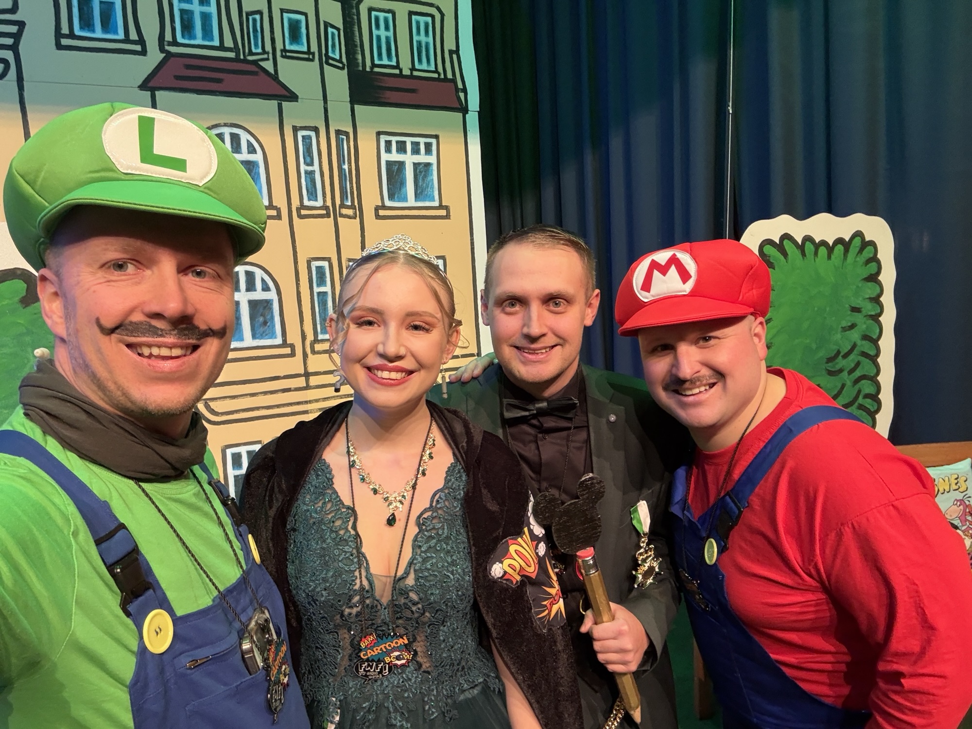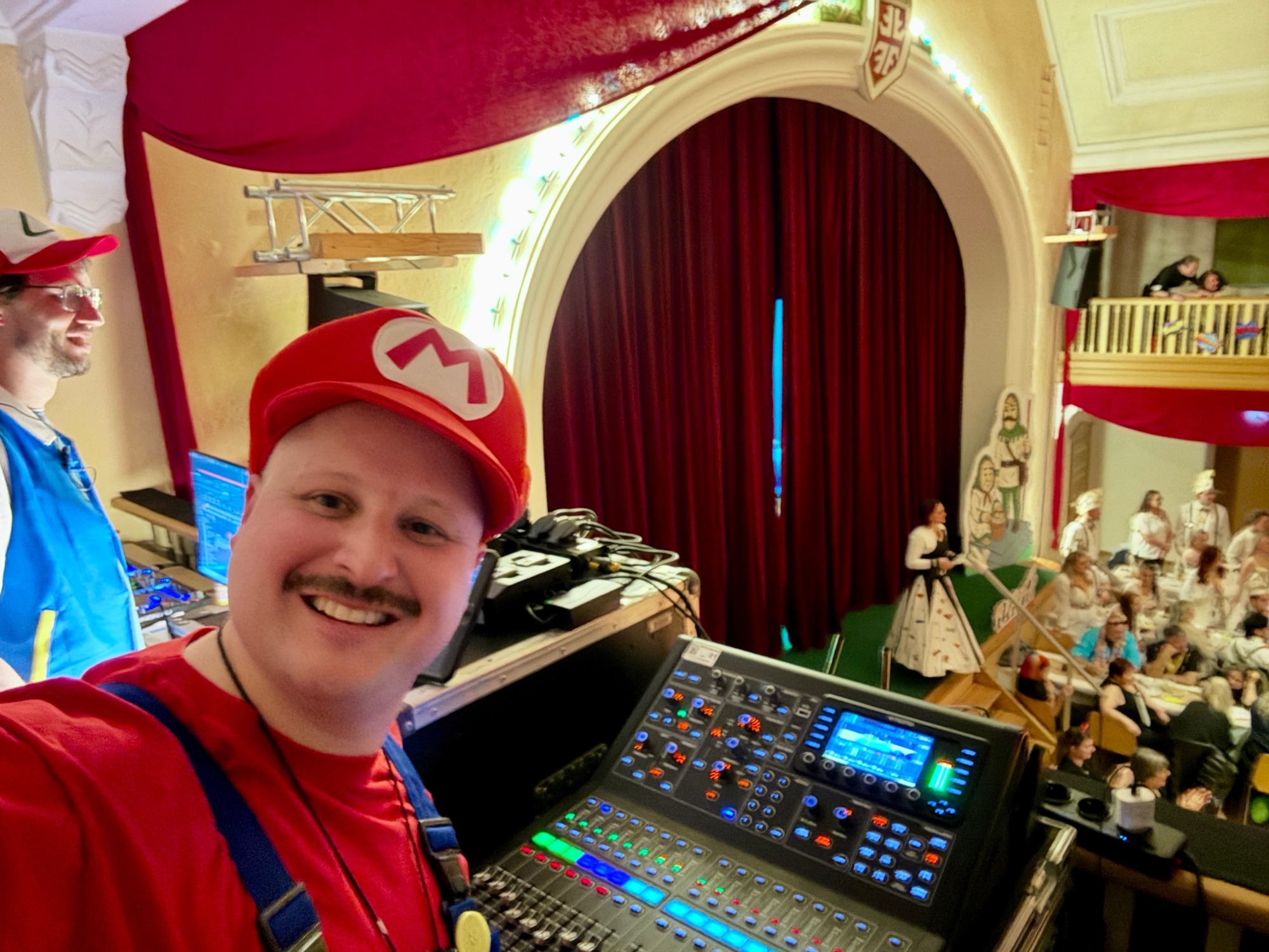 Während Alex schon ab Donnerstag mit den Fastnachtsfreunden beim Aufbau der Saaltechnik beschäftigt war, starteten wir am Freitagnachmittag mit Aufbau und Soundcheck von unserem Equipment. Neben unseren Instrumenten hatten wir diesmal auch ordentlich Licht im Gepäck: neue Movinghead-Tower, zwei mächtige Bee-Movingheads, Etec 150 Spot Movingheads und ein farbenfrohes LED-Grundlicht – perfekt abgestimmt auf das Comic-Motto. Ein passendes Keyboard-Banner durfte natürlich nicht fehlen. Kostümiert waren wir als die Mario Brothers – Alex als Mario und Conni als Luigi!