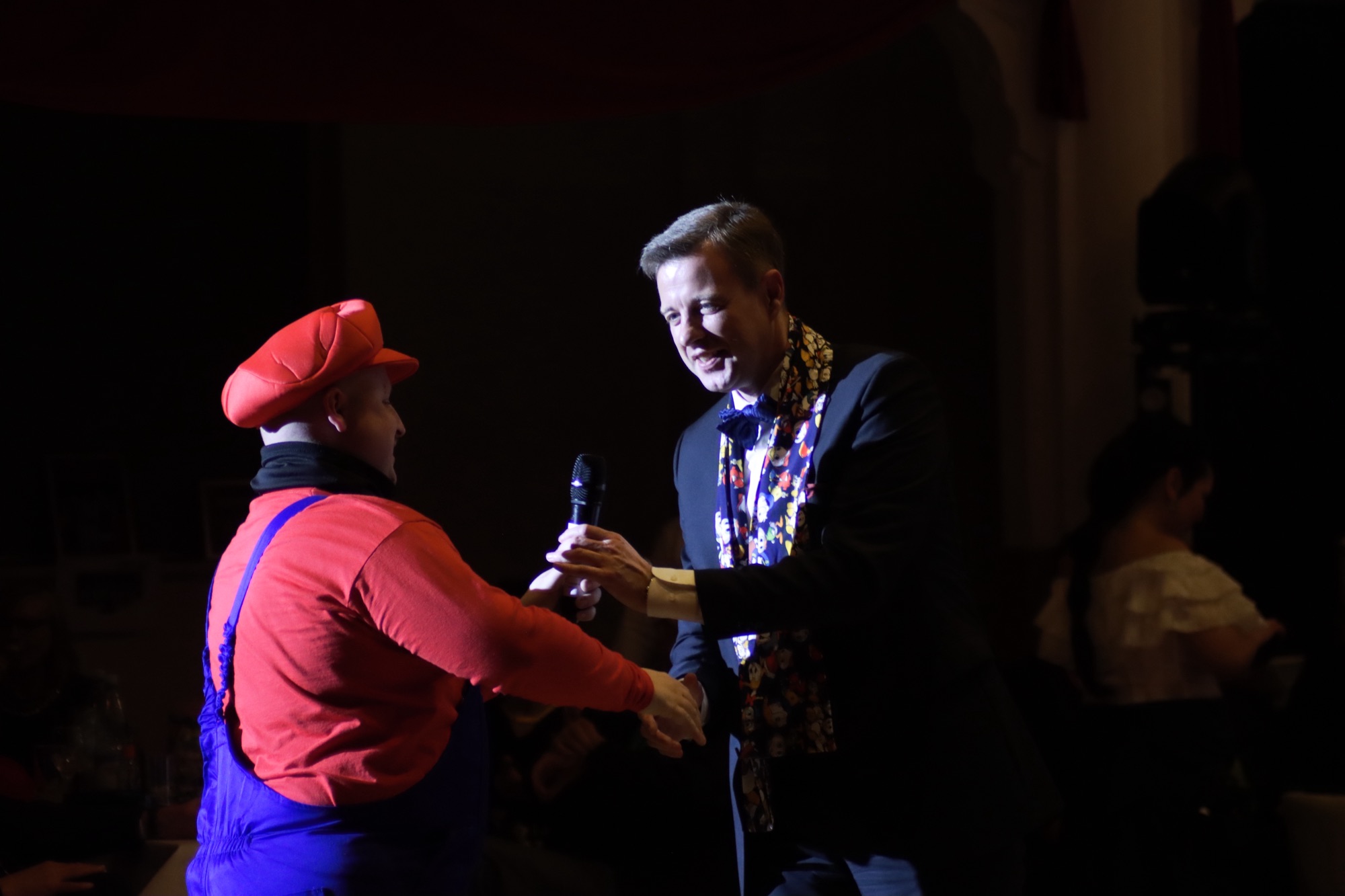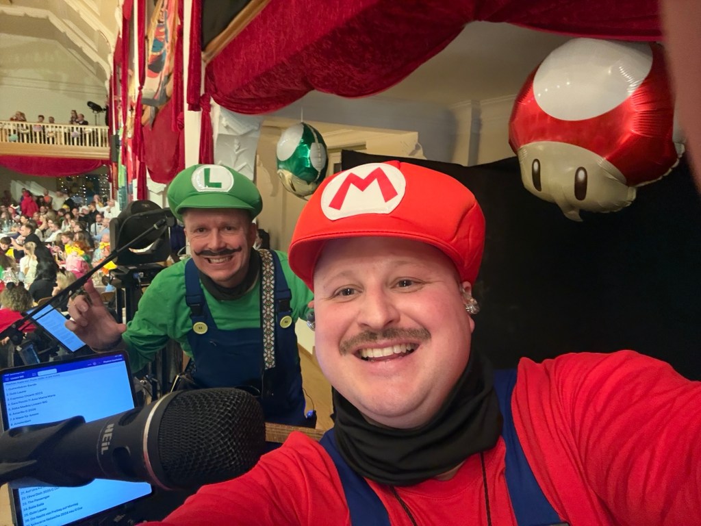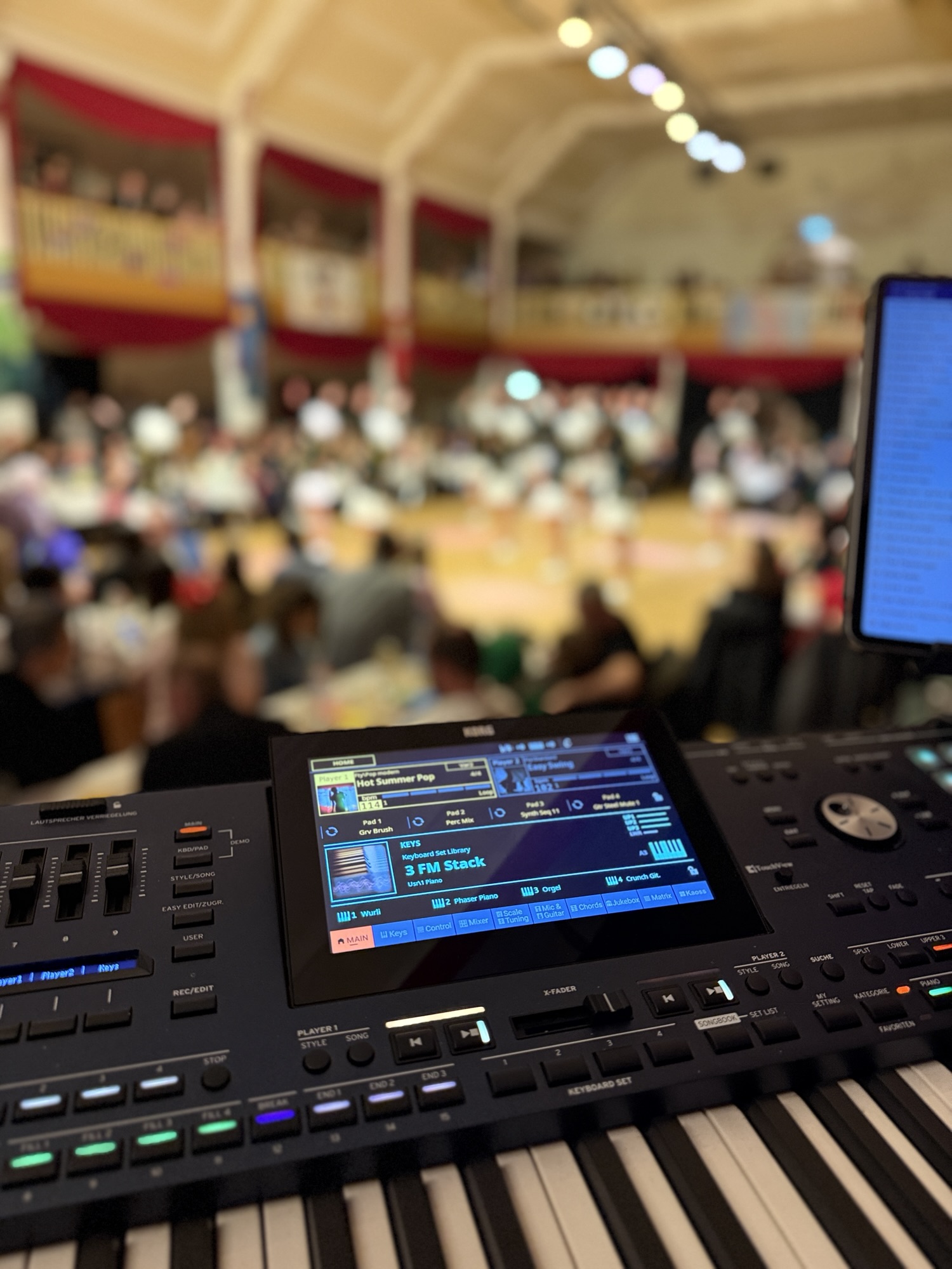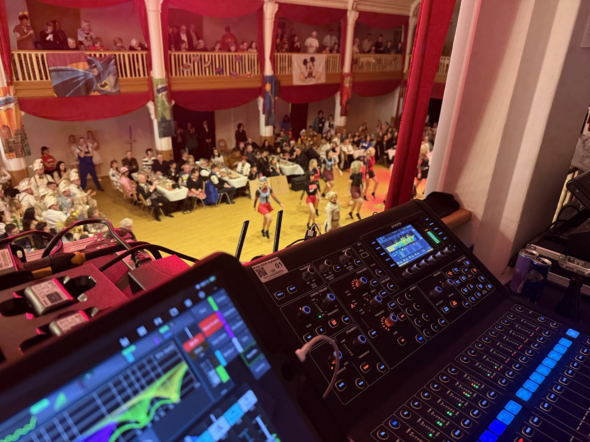 Während Alex schon ab Donnerstag mit den Fastnachtsfreunden beim Aufbau der Saaltechnik beschäftigt war, starteten wir am Freitagnachmittag mit Aufbau und Soundcheck von unserem Equipment. Neben unseren Instrumenten hatten wir diesmal auch ordentlich Licht im Gepäck: neue Movinghead-Tower, zwei mächtige Bee-Movingheads, Etec 150 Spot Movingheads und ein farbenfrohes LED-Grundlicht – perfekt abgestimmt auf das Comic-Motto. Ein passendes Keyboard-Banner durfte natürlich nicht fehlen. Kostümiert waren wir als die Mario Brothers – Alex als Mario und Conni als Luigi!